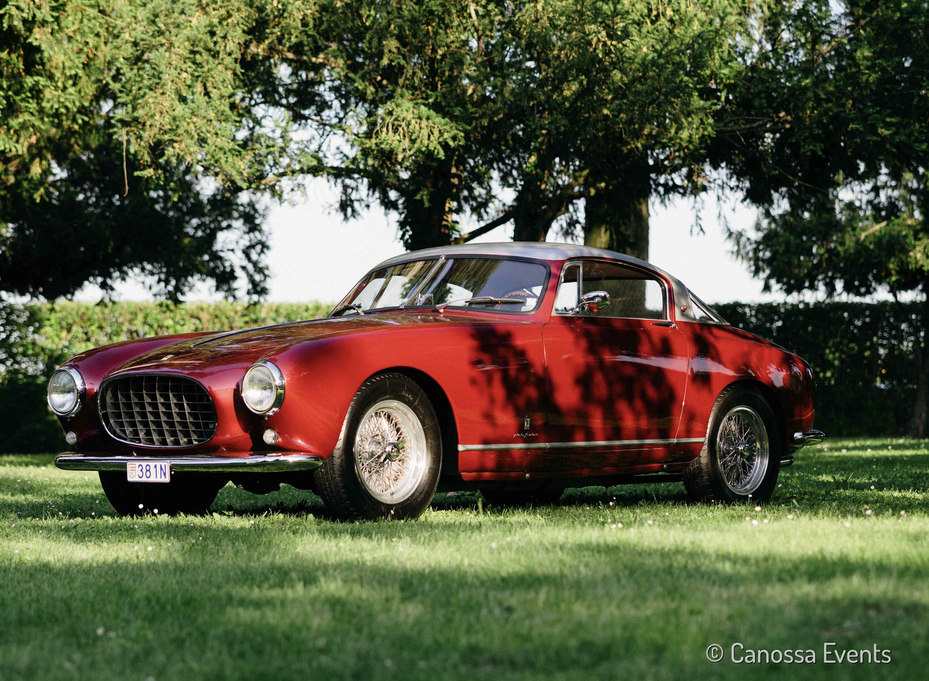 The 250 europa GT is a sports car built by Ferrari in 1955. It was presented at the 1954 Paris Motor Show and replaced the 250 Europa. In the beginning it was called "250 Europa" too, but later "GT" was added to distinguish the two series. They were two very similar models, and the most important aesthetic difference was the distance between the front mudguard and the windshield pillars. It was also similar to 375 America. However, what mostly distinguished the two models was the engine. The "250 Europa" was equipped with a "long" V12 engine designed by Aurelio Lampredi, while the "250 europa GT" had installed a "short" V12 conceived by Gioachino Colombo. Thanks to the shortening of the engine size, it was possible to shorten the wheelbase by 200 mm to a total of 2600 mm, without however reducing the space in the passenger compartment. The track width was increased. Another element that distinguished the "250 europa GT" from the "250 Europa" was the chassis. The latter on the "250 europa GT" consisted of two main tubes positioned longitudinally, with transverse cross-shaped reinforcements and external supports on which the bodywork was mounted. These main tubes of the chassis passed over the rear axle and not below. The 3 litre engine was a front- mounted longitudinal 60° V12. It had a displacement of 2963.45 cm3 with bore and stroke of 68 mm. The compression ratio was 8:1. It was fed by three Weber 36 or 42 DCZ double-barrel carburettors. The distribution was SOHC with two valves per cylinder. The spark was single with two distributors. Lubrication was wet sump while the clutch was double disc. The power output was 200 hp at 6300 rpm. There were many difference between the "long" engine of the 250 Europa (Lampredi) and the "short" engine mounted on the "250 europa GT" (Colombo). The former had the cylinder liners screwed into the cylinder head, and therefore needed more space. The latter had a more common cylinder liner, inserted with a gasket in the cylinder head, and this led the engine to be more compact. The front suspension were independent, with transversal wishbones, a single transverse leaf spring, later replaced by coil-overs. The rear suspension was live axle, supported by semi-elliptical leaf springs; Houdaille lever hydraulic shock absorbers were on four corners. The gearbox had four synchronized speed and various final ratios, available at the customer's choice. The steering was worm and sector. The brakes were drum on the four wheels with hydraulic assistance. Top speed was around 220 km/h. Almost all models produced were left-hand drive, except for one. The "250 europa GT" was the landmark for the Ferrari road cars that followed, thanks to the homogeneity in its construction. From this model, Pinin Farina became the almost unique designer for the series Ferraris. In addition, modifications to the engine and chassis of this model would have traced the road to Ferrari's road cars for about ten years, under the generation of models of the "250 GT" class. The car was only available by special order, and Ferrari were famously finicky about who they accepted as customers – the 250 was also the very first grand tourer from the Maranello based company.