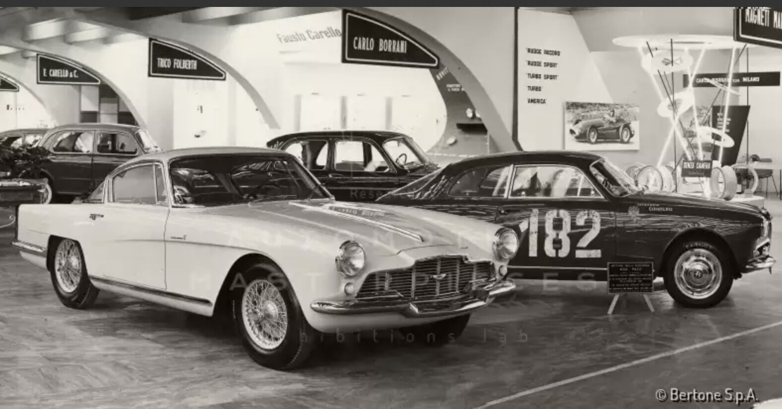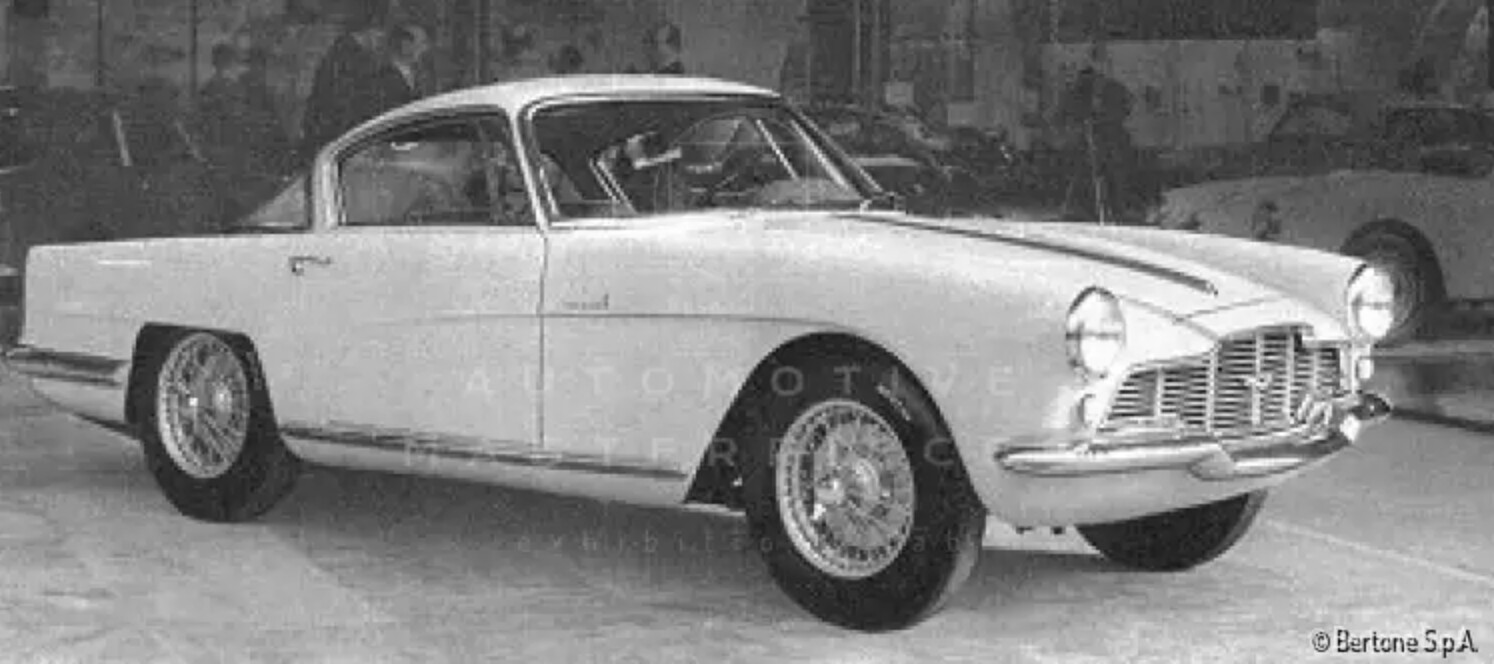 One-of-a-kind unit designed by Bertone's own Franco Scaglione in August 1954 and then delivered to Henry Pagezy of Paris the following January. Factory records show that the car was ordered by Wacky Arnolt for him but given the slightly misspelled spelling, it is believed that this customer could actually be Henri Pigozzi, founder of the Société Industrielle de Mécanique et Carrosserie Automobile, better known as Simca and it is curious that some features of the LML/765, such as the rear lights, were borrowed from Simca cars. Bertone reportedly planned to build a small run of Aston Martin based Berlinettas, but the British company refused to supply any further rolling chassis. Bertone subsequently exhibited the two-seater coupé at the Salone dell’Automobile in Torino twice, in 1957 (painted white) and 1958 (painted blue). The car later crossed the ocean and was in the US in 1976, in the hands of John G. Gyann. It was then owned by Dr. Jim Pavlatos, who undertook a first restoration. It then passed through the Chicago sports car dealer, Bill Jacobs, and finally arrived at the Blackhawk Collection. In 1987, it was purchased by Roger Karlson, who had the car for eleven years and spent considerable time and resources refining the previous restoration. The car was displayed in 1987 at Pebble Beach. In 2019, the car was purchased by a new owner, who commissioned Aston Martin specialists Kevin Kay Restorations of Redding, California, to undertake a full concours restoration. The car thus participated in the 2023 Pebble Beach Concours d'Elegance, where it was awarded First in Class. This unique body has a pronounced wraparound rear window and neatly creased fenders. The interior has a very unusual dash which looks more modern than that of the other Bertone built cars. The vehicle featured airy interiors, a long bonnet, and a short, flat boot, outlined by two slight tail fins with large lights. Powered by the renovated twin cam, 6-cylinder 2922 ccs engine (140 bhp at 5000 rpm), the car flaunted a formal balance of notable effect and some unusual solutions, like the front bumper in two separate sections. This is the only coupe built, of seven Aston Martin chassis supplied to Bertone by Stanley 'Wacky' Arnolt, that is known to exist. The car was praised as a typical Scaglione work of art, by historian Stanley Nowak in his article on the Bertone Aston Martins in Automobile Quarterly, Vol. 26 No. 4.