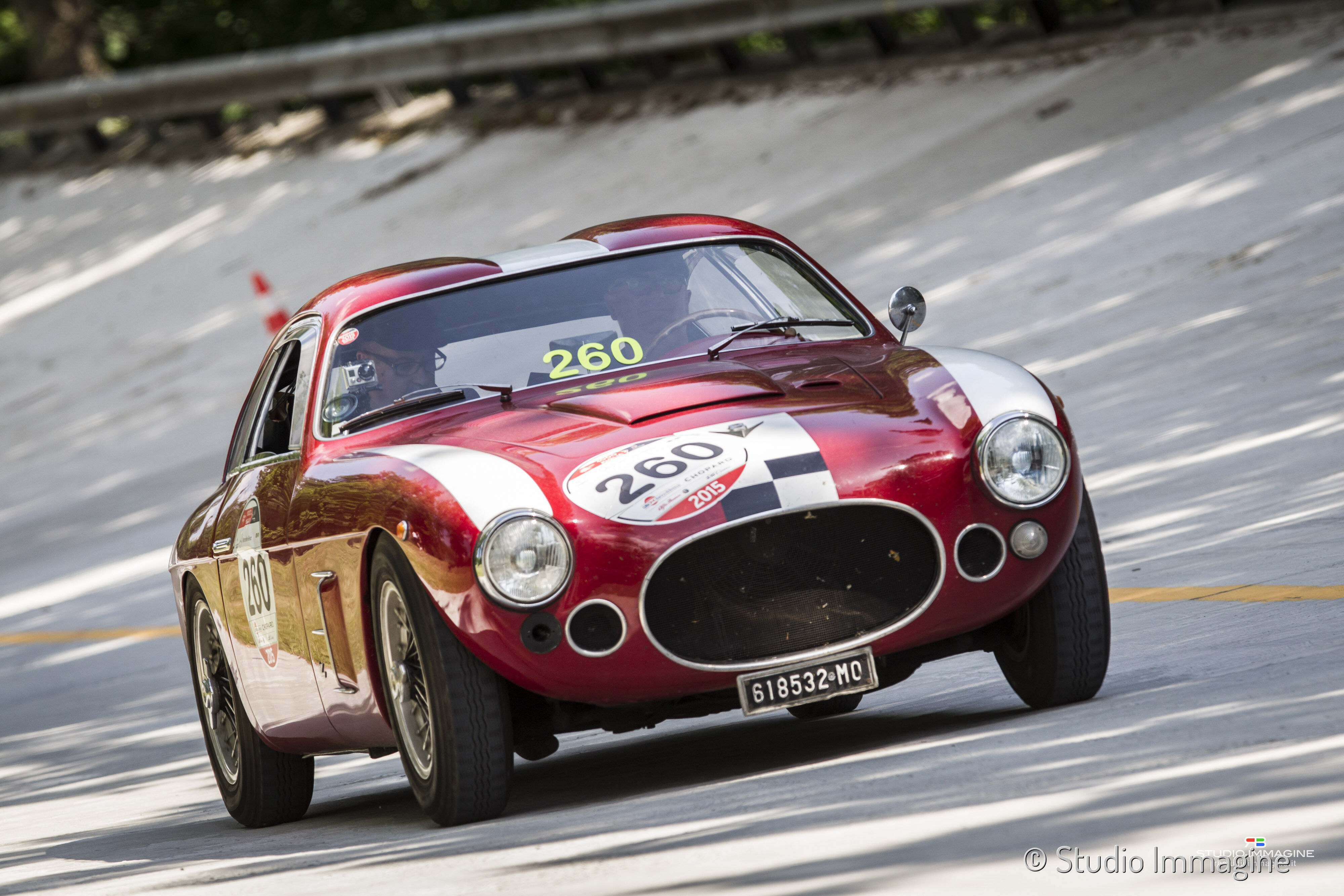 Chassis 106.000083 was delivered by Fiat to Zagato as rolling chassis in May 29, 1954. It is the 5th of only six 8V with double-bubble roof (000026, 000078, 000081, 000082, 000083, 000084). Chassis 106.000083 was very similar to 000084 Elio Zagato's winning 8V. The differences are the extra air ducts between grille and head lamps and the two window wipers with respect to the three on the Elio's car. One of the other details on this car is the checkered paint job on the nose, a characteristic also present on 000081. The first owners were Carrozzeria La Zagato and Franco Cornacchia who raced it several times with PROVA plates as a kind of publicity stunt to promote the Zagato cars. In 1956 106.000083 started an impressive racing career in the hands of Gianfranco Bonetto, Renzo Cigarini and Franco Lisitano. It ran from 1956 to 1965 several races including Coppa Inter-Europa, Mille Miglia and Targa Florio.