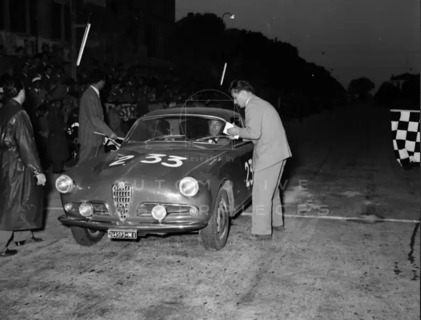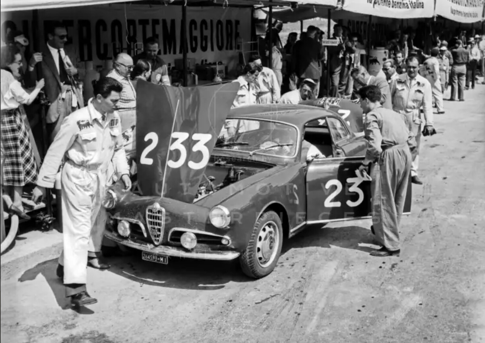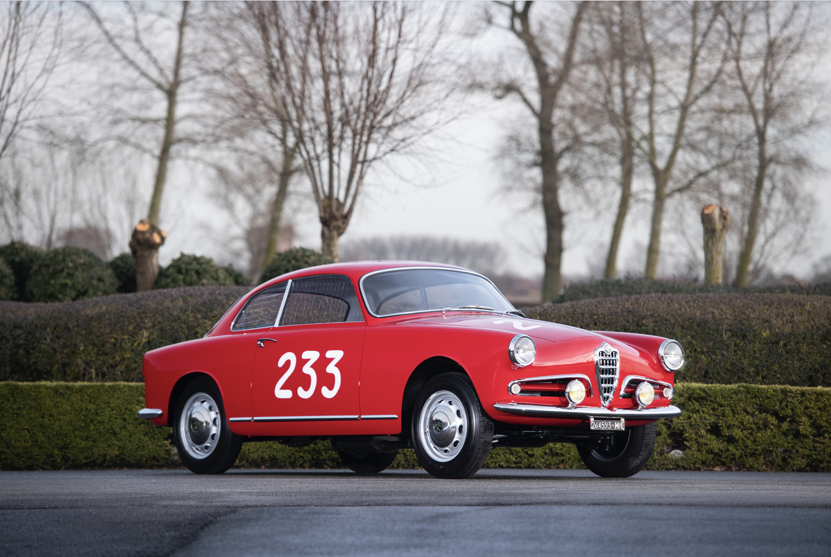 On February 1955, Agostino Di Stefano, a wealthy man from Milan, bought the Giulietta Sprint, chassis n° AR1493*00094* at the Minetti’s Alfa Romeo dealership. He paid the car Lit. 1.903.000. The Giulietta was in red Alfa solid color and it was homologated with the license plate number MI264593 on 25 February; it was delivered on February 26th. The Alfa Romeo Giulietta Sprint, year 1955, chassis n° AR1493*00094* is one of the very first Giulietta Sprint built (date of production 21 February 1955). The Giulietta production began with the Sprint in 1954 with a dozen units produced that year. This car, chassis n° 00094 is considered in fact still a “pre-series” since, from the car chassis number 00996, important changes will be introduced and from 1957 began an even more modified series. The 2nd series dates 1959. Agostino Di Stefano had a real passion for the cars since he was a kid and he dreamed to drive in a race his grandfather’s Bugatti a day. Also he joined in many competitions, although not belonging to any racing team, from 1948 onwards, always with his cars. Because he was 41 years old, he decided to compete in the Mille Miglia with the new little sport car, famous for the handling and light enough to let him to drive for 1624 km in in a quite relaxing way. Chassis n° AR1493*00094*faced the Mille Miglia with race number 233, ranking 130th overall and 13th in class, completing the path in 15h 32’46”. It was the only (successful) participation of Agostino Di Stefano to the Mille Miglia. He also registered in 1951, 1954, 1956, 1957 with other cars, but he never started. Chassis n° AR1493*00094*after a long period of conservation but relative neglect, it was found in 2016 in a state of barn find. Complete, but with many important works to be done. The car has been sold and has undergone a long and deep restoration, completed in 2019, to bring it back to the state of the art. In exceptional condition, the car was recently sold to a new owner. The Centro Documentazione Alfa Romeo historical register also certifies that the actual engine, AR 1315 00186, is original and matching numbers.