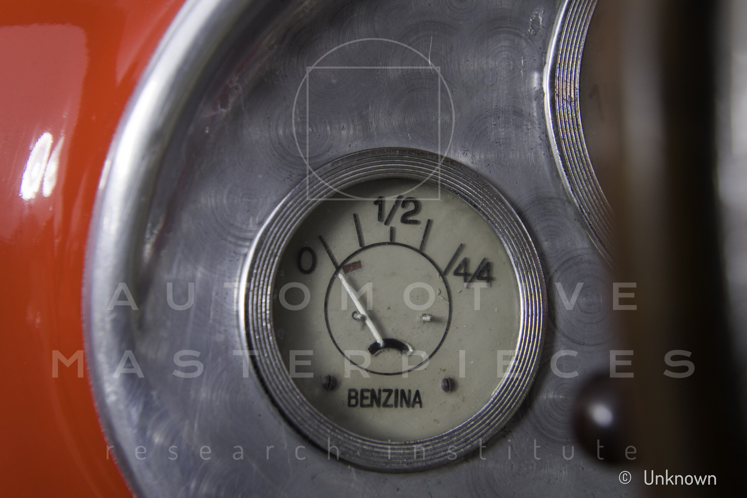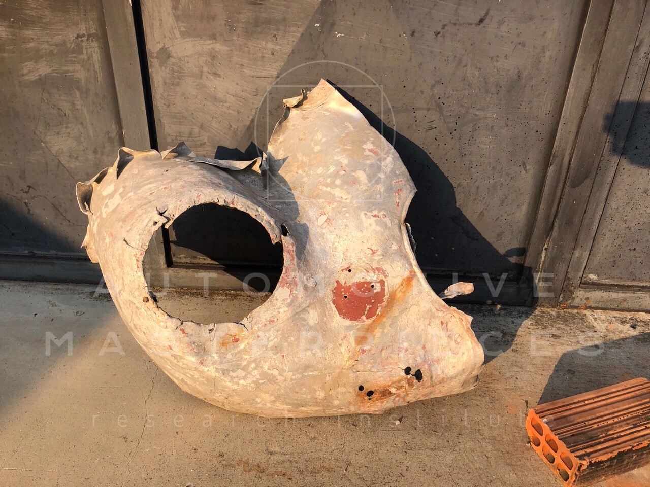 Giuseppe Pilone shows a piece of aluminum front fender replaced during the restoration and still in his shed. He also kept two images of the fresh restoration car.