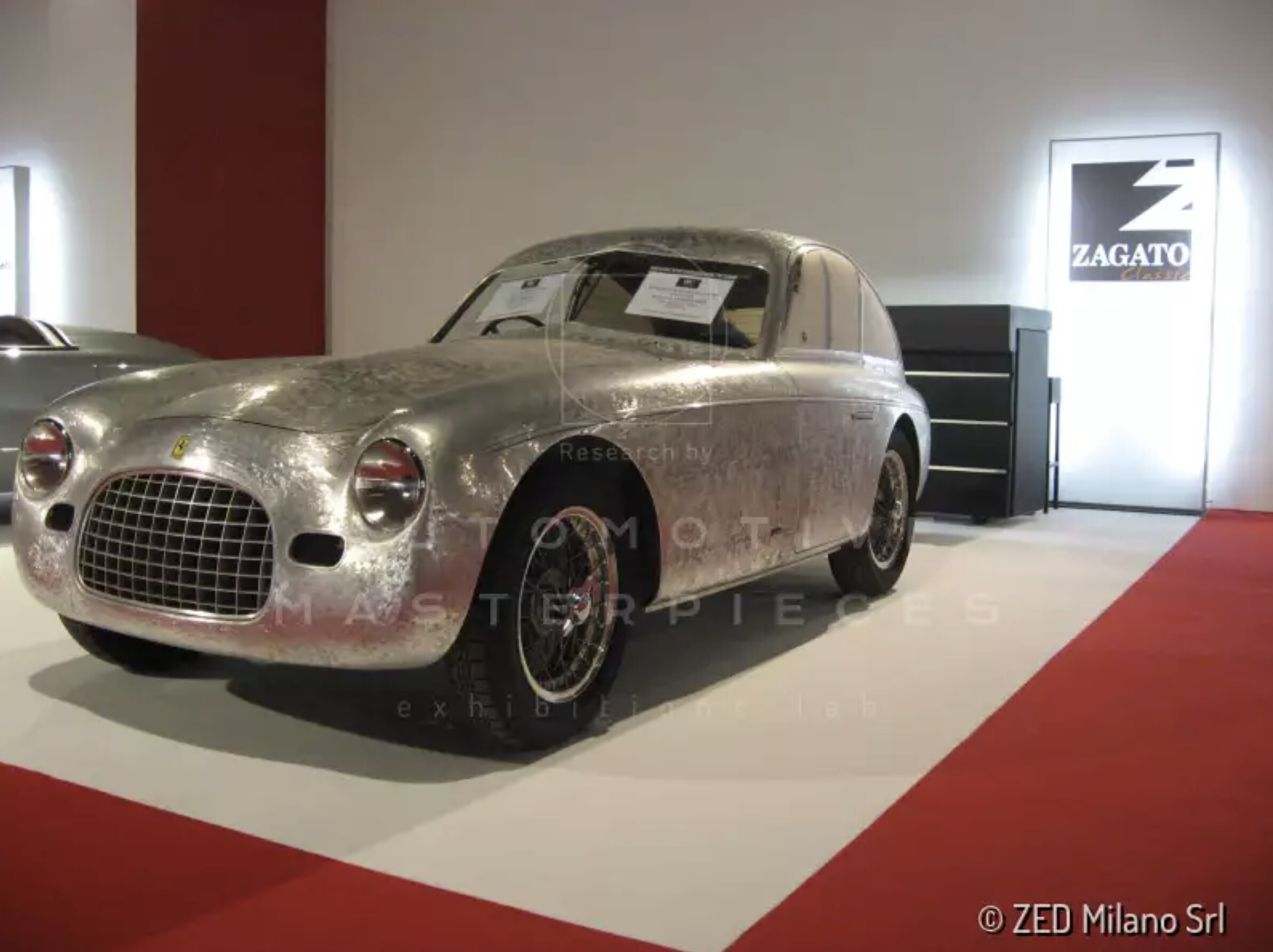The ‘Panoramica’ bodywork concept, invented by Ugo Zagato in the late Forties, recalls once again the aeronautical vocation of the brand. Built with the cockpit of an aircraft in mind, it meant to optimize visibility and consequently drivability and comfort. One key factor was the use of plexiglass, a type of material that was still innovative at that time. Zagato preferred it to glass because of its objective qualities: light, pliable, and safe. In this way, it became possible to produce extensive transparent surfaces, up to the roof, making the cabins of the Zagato Panoramica’s a lot more habitable than those of traditional coupes, while keeping the weight down. The tail then had the task to link the central part of the car to the waistline and the flanks, which were always low and sleek. Zagato applied these solutions to very diverse cars in spirit and vocation: the Fiat 500’s Zagato and 1100’s, the Lancia Ardea’s, the Alfa Romeo 8C’s 2300, but also an MG YA and a Maserati A6 1500 were all Panoramica. The Ferrari 166 MM Coupé Panoramica (it was described as such in an advertisement that appeared in July 1949 in the magazine ‘L’Automobile’ to celebrate the 30th anniversary of the Carrozzeria Zagato) was born as a race car. This was thanks to Elio Zagato, who envisaged strong racing abilities for the Panoramica-bodied cars, and Antonio Stagnoli, a renowned gentleman driver, who made a specific request for such a car. Both of them, Scuderia Ambrosiana drivers, turned to Enzo Ferrari (who used to call Elio: ‘Zagatino’, i.e., little Zagato) to ask him to produce a Panoramica body for a Ferrari chassis to race in the Mille Miglia. After all, it was a Ferrari that had won the 1948 Mille Miglia, giving the new-born scuderia the opportunity to join the big players in the car racing world. The chassis (numbered 0018M) and the engine (12 cylinders, 2.0 liters), purchased in Maranello, were then taken to Zagato’s workshop in Milan, where they were clad with a light body of thin aluminum panels. It seems that Gioacchino Colombo, a consultant for Ferrari and a friend of Ugo’s, had his say in this, proving that the two brands worked very closely together on the project. The 166 Coupe Panoramica was completed in the summer of ’49 and started racing immediately at the Senigallia track. But its real debut happened the following year: in 1950, it won the Coppa Intereuropa, the Parma-Poggio di Berceto, and the Aosta-Gran San Bernardo races. Unfortunately, it failed to win the Mille Miglia, as it finished only 36th overall and fourth in its class. This disappointing result and at the same time the notion of its big potential in the steeplechases could be the reason why Zagato transformed it into a barchetta ‘siluro’ (torpedo) at the end of 1950.