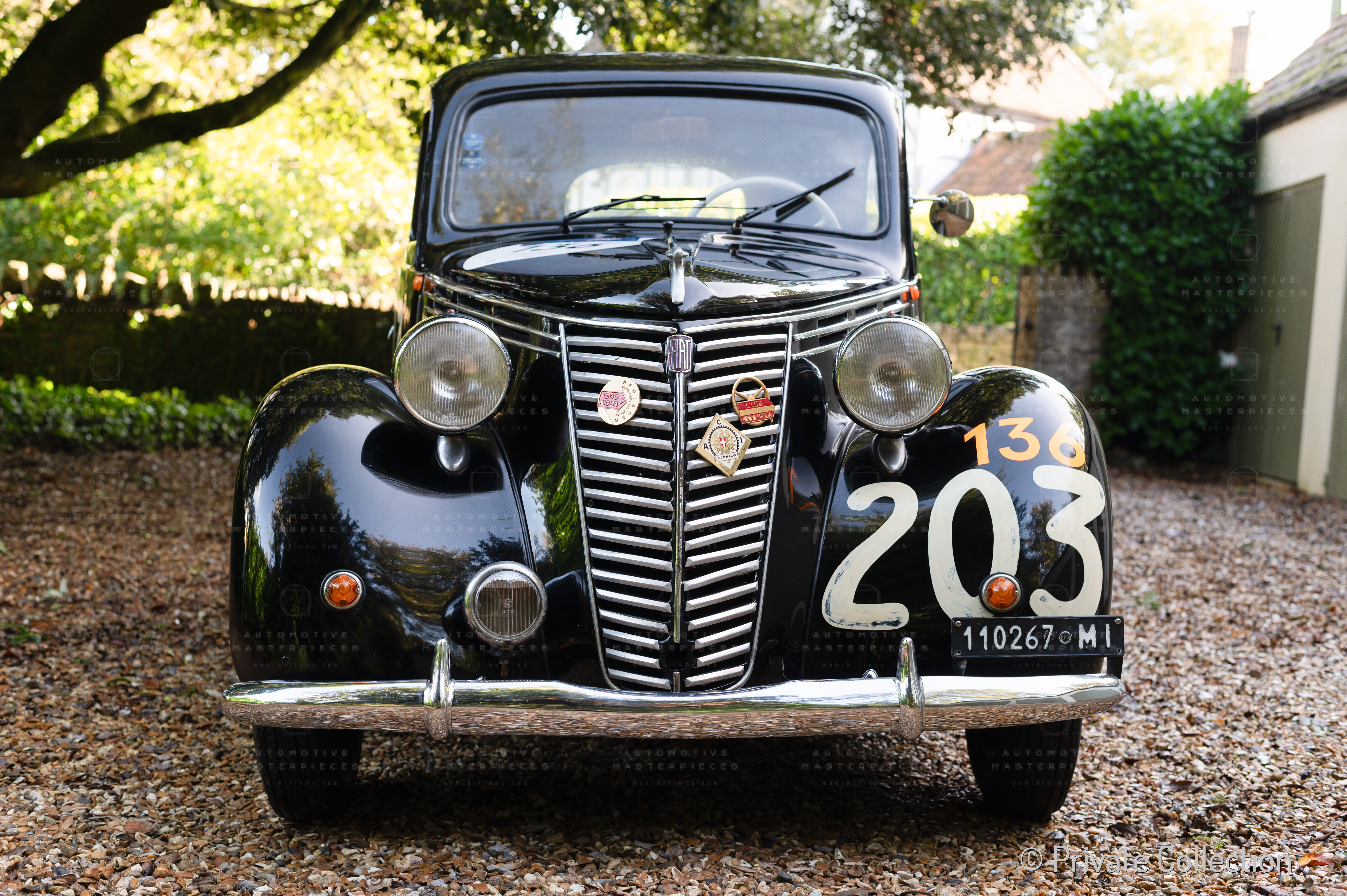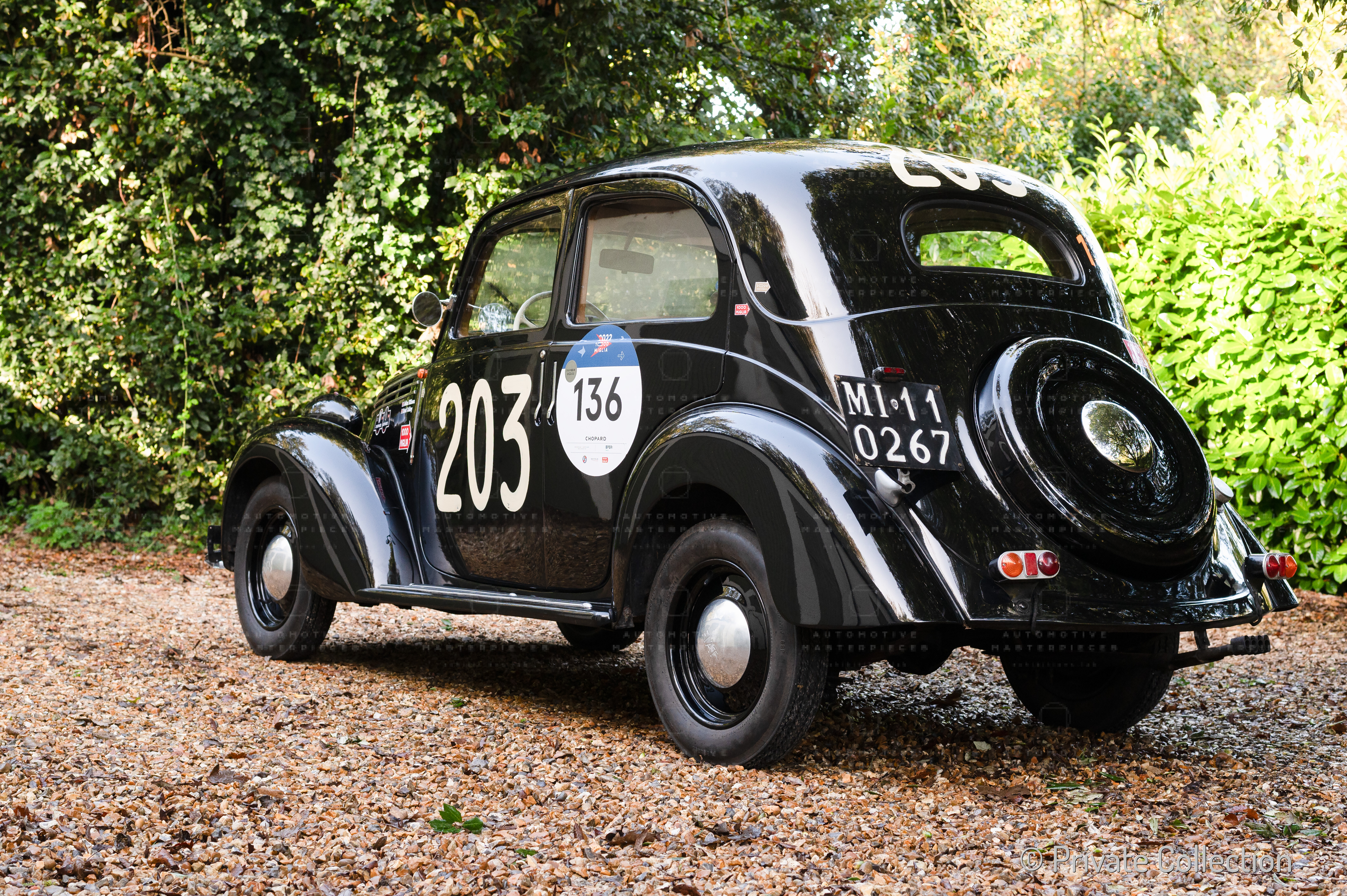The 1947 Fiat 1100 (Fiat) sn 1100*293098* was completed in December 1947 and registered exactly one month later, in January 1948, with Milan plates. The car is registered to the "Società di Fatto Luigi Zaini", an important family-run "Factory of Chocolate, Cocoa, Candies, Jams and Similar" founded in Milan in 1913. Once the founder, Luigi, died prematurely, the company was run for a period by his widow, Olga: it was an exceptional fact for the time to see a woman at the helm of a company. In the mid-1950s she handed over the helm to her two sons: Vittorio and Pietro but, before this commitment, the young Pietro would still have the freedom to be a gentleman driver. As could only happen at the time, Pietro entered the most important road race in 1949 with the family car (perhaps purchased for the occasion?): the Mille Miglia. His lifelong friend and companion on a thousand adventures, Pietro Moscatelli, was his co-driver. The black sedan lined up with the racing number 203 painted on the doors at the starting line at 2:03 AM on April 24. It was able to get to the end of the race, covering it with a good pace; in fact, it qualified 120th overall and 37th in class. A more than honorable result for a 1100 cc private touring sedan. At the end of the summer Zaini sold the Fiat 1100 to a new owner, who was in turn followed by a few others until, today, the car is completely restored and returns to the roads of the Mille Miglia, taking part in the re-enactments. On June 13, 2022, Automotive Masterpieces organized a photoshoot of the car in front of the company of the first owner Zaini with his nephew Luigi.