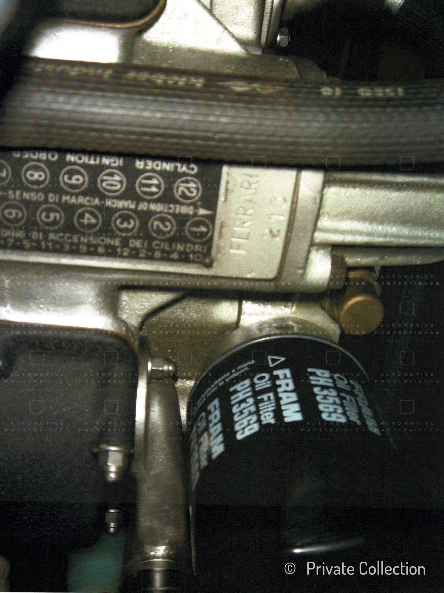 60° V-type - Tipo 213/Comp: Dry sump lubrication, lightweight balanced crankshaft, high-compression pistons, and ported cylinder heads.