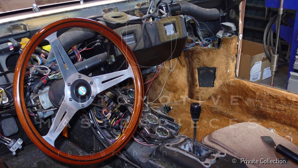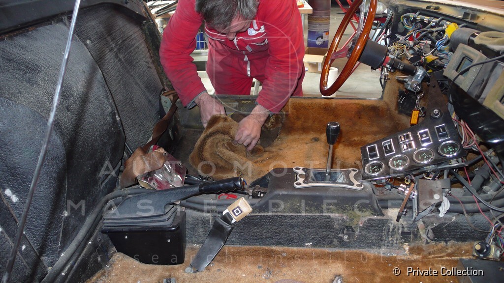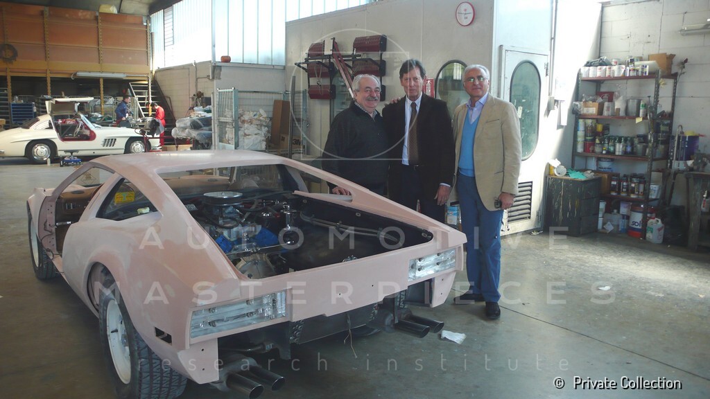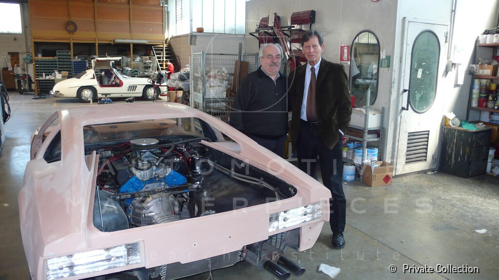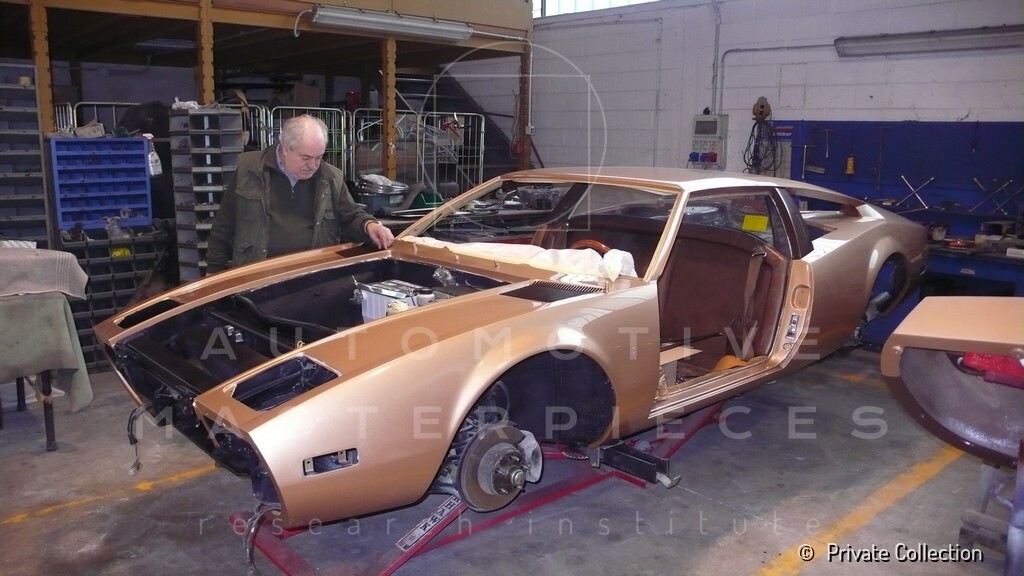 Don De La Rossa supervises the "conversion" of the "Pantera II 7x" to "Montella" road car as follows: remove Pantera name from nose and tail, added rubber strip around belting, added hood vent to allow radiator hot air to exit, added side mirrors, repainted car in pearl white over metallic bronze, added De Tomaso and Montella nameplates