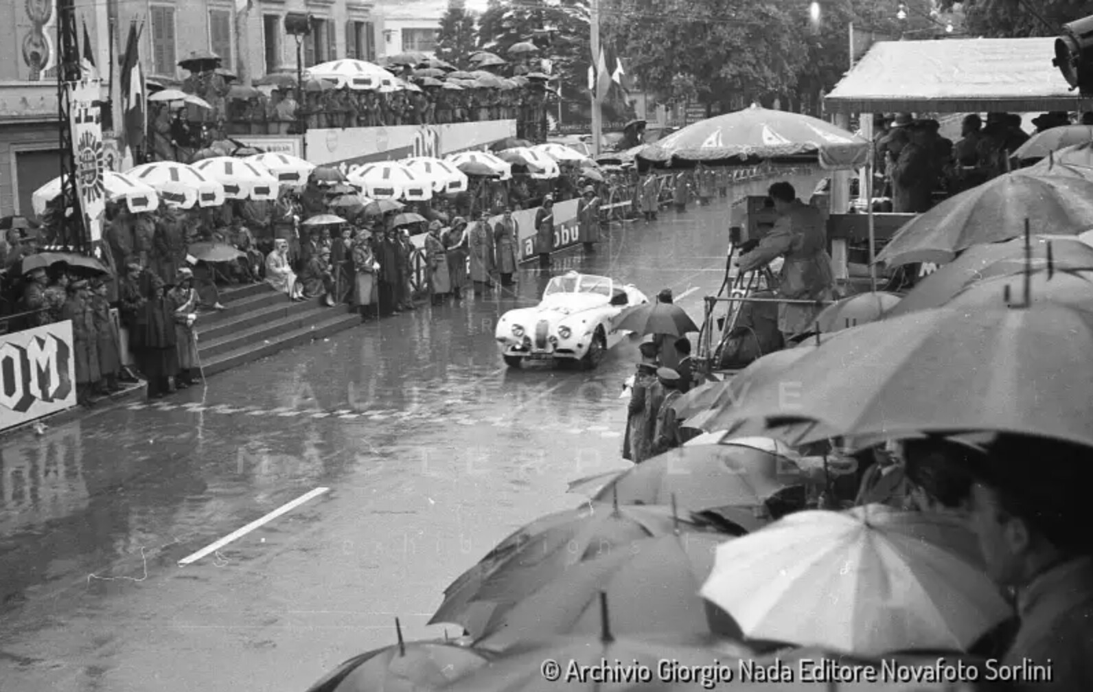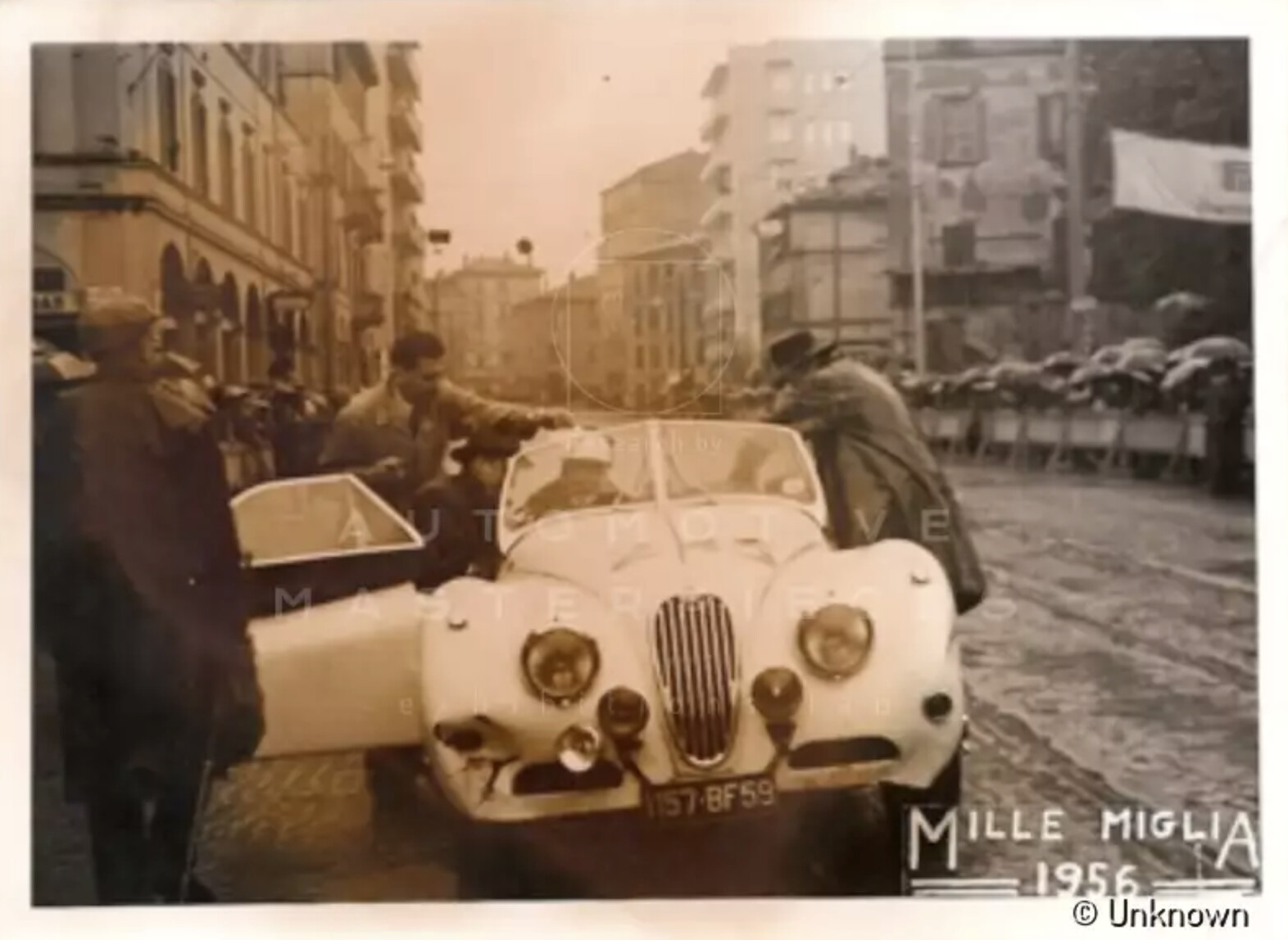 Jaguar XK 140 OTS with chassis no. S800035DN was built as one of the only 3 Works Jaguar XK 140s.The other two, S800033DN and S800034DN were painted British Racing Green, but S800035DN was painted white Cream: the favourite colour of its driver Ian Appleyard, one of the most successful rally drivers of its decade. After the car was sold by Jaguar, it went to France and has been delivered to Mr. Georges Guyot. He drove the car at the 1956 Mille Miglia, finishing in 14 hours, 7 minutes and 15 seconds, ranking 40th overall and winning its class ("Sports cars with price limit, not exceeding Lit. 2.000.000"). Guyot drove the car quite a lot: as can be seen by the oil service paper, the Jaguar had driven almost 50.000 kilometers in 1959. The average amount of kilometers was not reached in the following years: in 1998 the Jaguar had only driven 93.240 kilometers since new. Chassis no. S800035DN was bought in 1966 by the French family Jacquin. Only two owners within the family have had the car since the 10th of february 1966. This example is 1 of the only 73 original Right Hand Drive Jaguar XK 140 OTS’s on a total of 3349 cars built. Furthermore, this example, as 1 of only 36, has the Special Equipment option (MC specification), with C Type head engine and wire wheels. Special equipment includes the optional overdrive. Nowadays the Jaguar is in original condition and in the same specification as it drove the Mille Miglia in 1956. The Jaguar still has its original engine, cylinder head and gearbox (matching numbers). it still has its original soft-top, leather interior, louvres on the bonnet and double petrol filler caps which you can recognize on the old Mille Miglia pictures. Current owner is the 3rd owner of the car from 2010. The car has covered only 108.000 km since new.