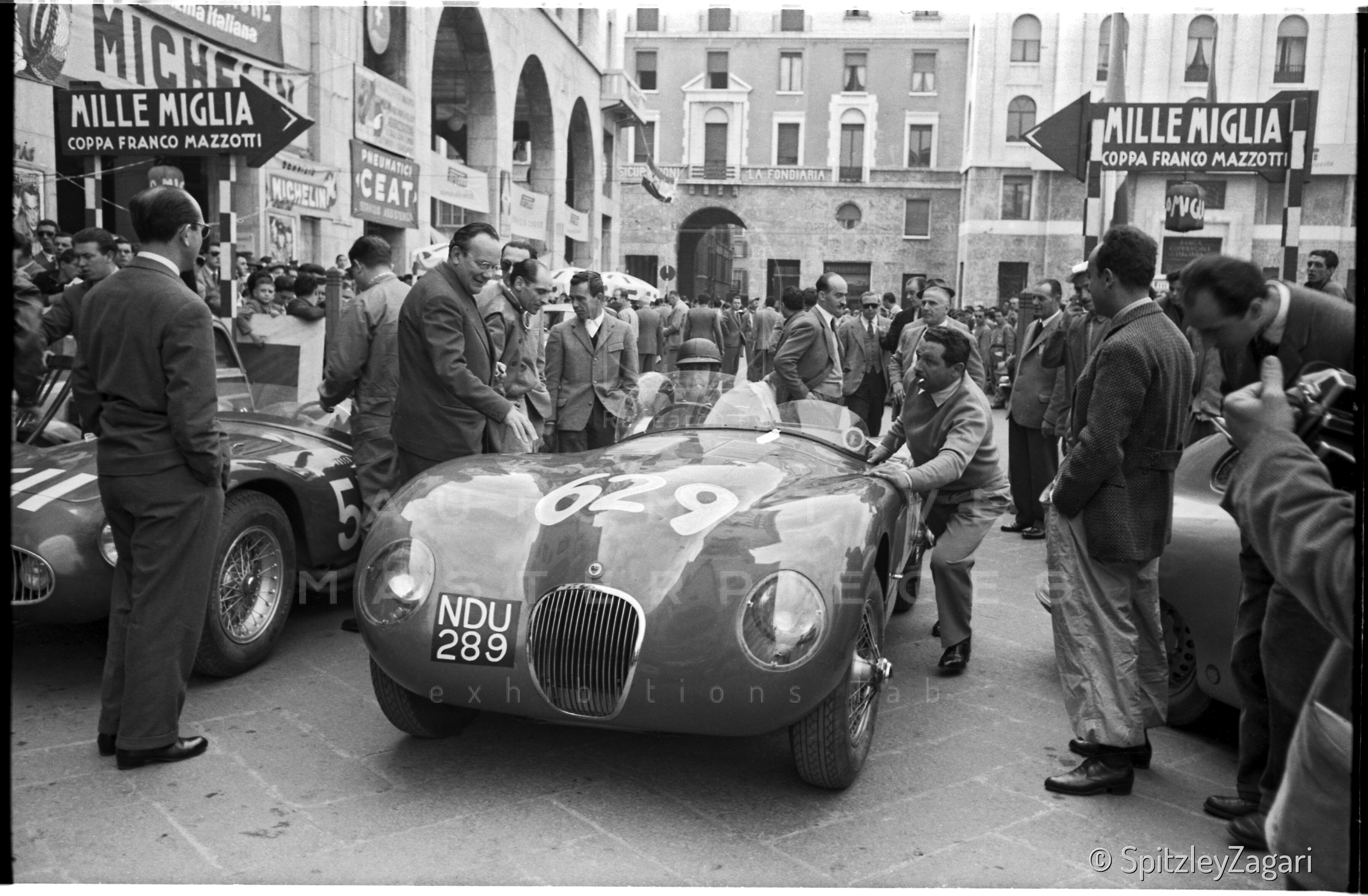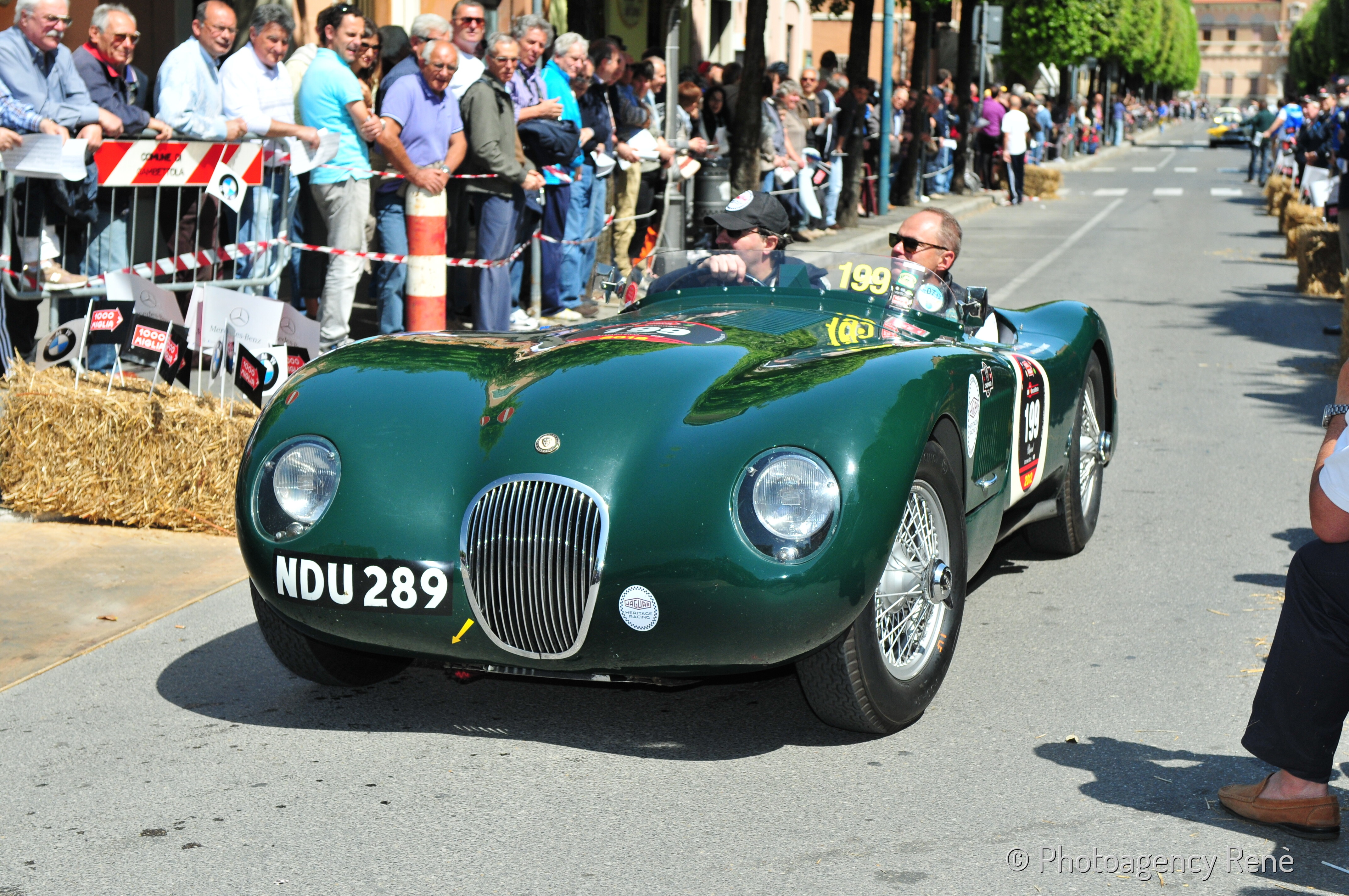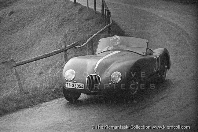 The C-type with chassis no. XKC 045 was produced and registered in the UK (NDU 289) on March 19, 1953. Despite being one of the later production cars and unlike the "works" cars, it was still fitted with SU carburetors and drum brakes. The car was sold as a “personal export delivery” in Italy through A. Chieregato of the Compagnia Generale Auto (Italian Jaguar distributor, in Milan) to Mario Tadini, a historic Alfa Romeo driver and Mille Miglia veteran, who entered it in the 1953 Mille Miglia with himself, Pietro Cagnana, and Franco Cortese, who, however, did not participate; the car, like most Jaguars that year, retired. The rest of the season was not productive since the car went back to the factory to fit the latest modifications, and Tadini sold XKC 045 to another driver: Ivo Badaracco of Lugano, who used it in hillclimb races. The next two owners, Silvio Moser, and Hans Maag were also drivers and raced with the car, by then aged, until 1965. XKC 045 then crossed the Channel and was acquired by the businessman and renown collector, Sir Anthony Bamford. Subsequent owners included Richard L Hubbard and Nigel Bradshaw from WT Aken and Company in St Anne’s, Lancashire. It appeared in a Motor Sport advertisement from July through September 1970, offered by David Mulvaney at Brian Classic’s in Didsbury, Manchester, and was noted for being restored to concours standards. Bob Roberts, founder of the Midland Motor Museum in Bridgnorth, purchased the car and occasionally had Mike Barker race it. The vehicle was at some point equipped with an early XK 140 SE engine, bearing the serial G 1042-8S; the whereabouts of its original engine remain unknown. In 1983, the Jaguar Daimler Heritage Trust in Coventry became the car's custodian; it was around then that the car received a replica bonnet. The original bonnet was reunited with the car in 2000. The vehicle was featured in the 1993 Jaguar factory procession to Le Mans and has participated in numerous vintage events under the Jaguar Daimler Heritage Trust’s auspices, including appearances at Goodwood, the Ennstal Klassik in Austria with Stirling Moss, and all (13) Mille Miglia from 2003 to 2015. The car is featured in specialized books, such as Sandro Binelli’s Mille Miglia's Chassis - The Ultimate Opus Volume III.