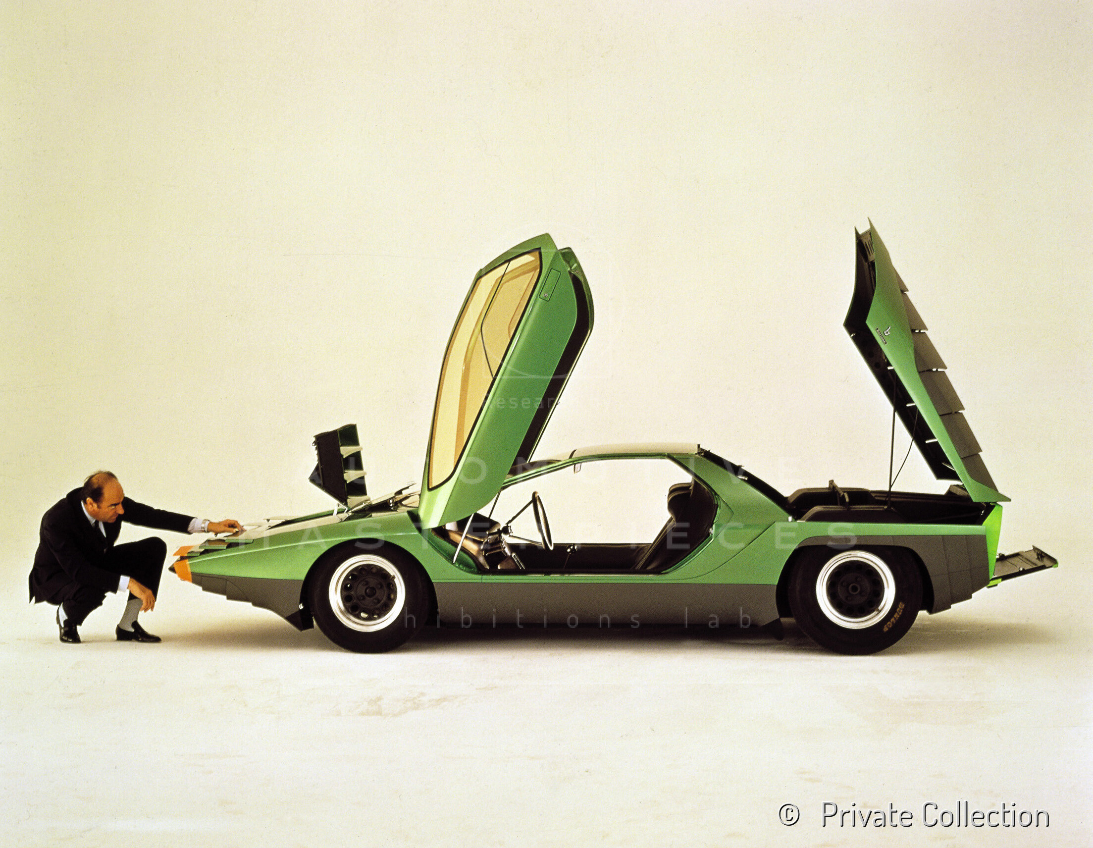 The Alfa Romeo 33 Bertone Carabo, also known as Alfa Romeo 33 Carabo or Bertone Carabo, is a dream car made by Alfa Romeo and Bertone coachbuilder in 1968. This car is the first of 6 dream cars based on the chassis of the Alfa Romeo 33 Stradale made by the most famous Italian coachbuilders at the turn of the 60s and 70s. The name Carabo derives from the beetle Carabus Auratus, of the Carabidae family, characterized by metallic and bright colors, and it is precisely with the colors (luminescent green with orange details and golden glass) and the vertical doors, which recall the elytra, of this insect that the coupé was exhibited at the Paris motor show in October 1968. The squared line of the fiberglass bodywork, designed with a wedge profile by Marcello Gandini and built by Bertone in just 10 weeks, is a design milestone automotive because it introduced square lines; in fact, it lays the foundations for many other hugely successful cars; in particular the Lancia Stratos Zero concept car and above all the Lamborghini Countach, also designed by Gandini for Bertone. The very sharp front is characterized by a metallic orange stripe that runs along the entire edge of the front, by a very thin black bumper, by the Alfa Romeo logo crowned by a black plastic ring and by the retractable headlights behind three adjustable tiles that when closed they integrate perfectly into the bodywork. In the center of the hood there are three vents for hot air from the radiator. The side profile is an almost perfect wedge that accentuates the car's low ground clearance, just 990 mm, separated into two chromatic halves, metallic green and black. Another of the innovative features of the Carabo are the mirrored gilded VHR crystals and the "scissor" doors that open vertically thanks to a gas piston, fitted for the first time on this car and then taken up on other concept cars and production cars, such as the Lamborghini Countach. The rear hood which incorporates the Bertone logo, the engine air intake and the rear spoiler is covered by a fixed shutter formed by six black plastic strips that allow the hot air of the engine to be vented and also allow a (limited) rear visibility. The rear mirror (truncated), of a brighter green than that of the bodywork, is dominated by a geometric panel in which the rear lights are incorporated and under which there are five black plastic elements that act as bumpers. Above it is also applied the identifying inscription with a particular handwriting: a small replica of the profile of the car with the door open with a special character every letter that makes up the word "Carabo". The interior is very simple with two sports seats and a dashboard; at the two opposite ends are placed speedometer and tachometer, while in the center are collected the secondary indicators. Very peculiar is the black two-spoke calyx steering wheel with the very depressed hub. The dream car, according to data declared by Bertone, was capable of reaching a top speed of 260 km/h and could accelerate from 0 to 100 km / h in 6.5 seconds. Originally, the prototype was equipped with the same 1,995 cm³ double-ignition V8 engine as the Alfa Romeo 33 Stradale, capable of delivering 230 hp at 8,800 rpm, placed in a central position and coupled to a 6 gears manual gearbox. On unknown date and for unknown reasons the original engine was replaced with the 2,593 cm³ 200 hp V8 built in series for AR Montreal. After the usual tour of the salons, the prototype, which remained unique, provided the inspiration for Marcello Gandini and Bertone to build other famous cars. Both the overall line and the scissor doors, later taken up by almost all future Lamborghinis, of the 1974 Lamborghini Countach derive strictly from the 1968 Carabo. Finally, in 1976 the Alfa Romeo-Bertone pairing worked together again on the chassis. of the Alfa Romeo 33 Stradale creating the Navajo, the last dream car in the series of 6 also made by other Italian coachbuilders, currently all kept together in the Alfa Romeo Historical Museum in Arese.