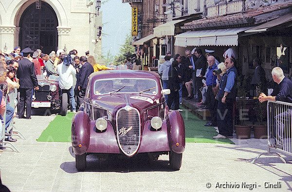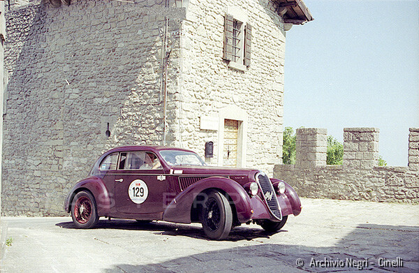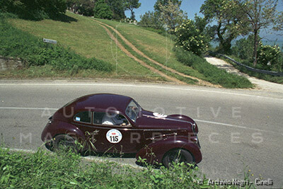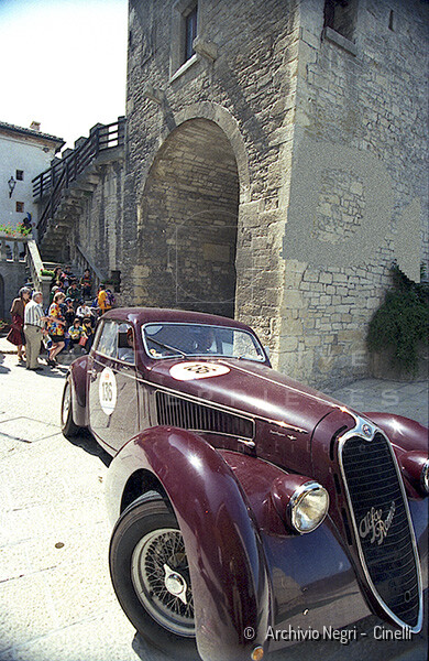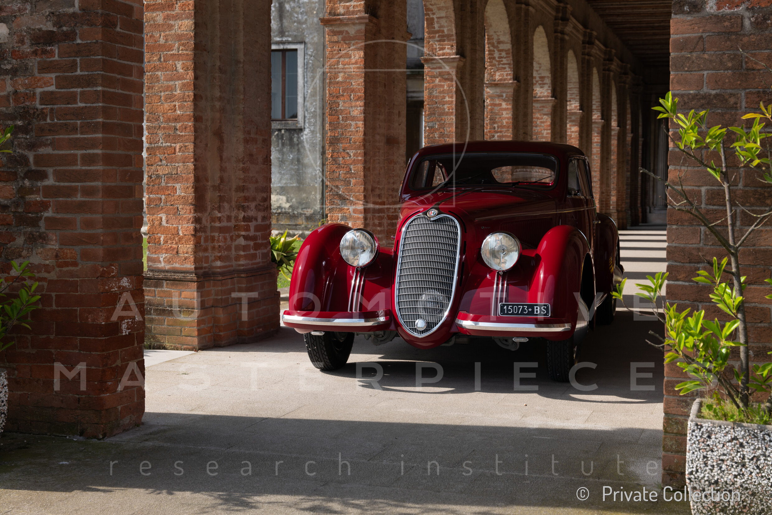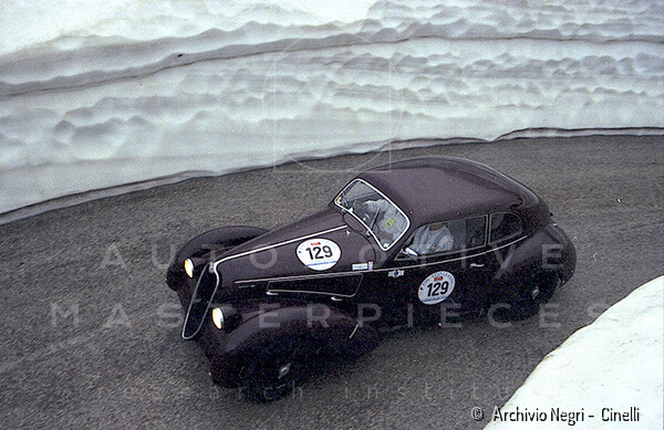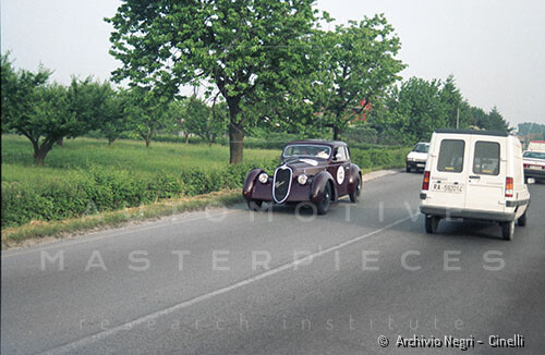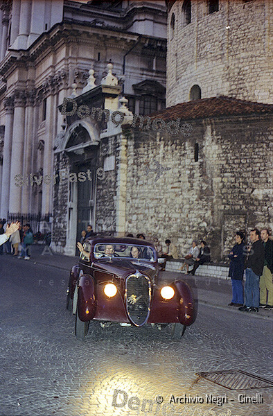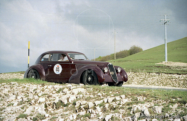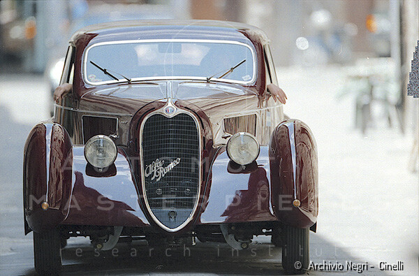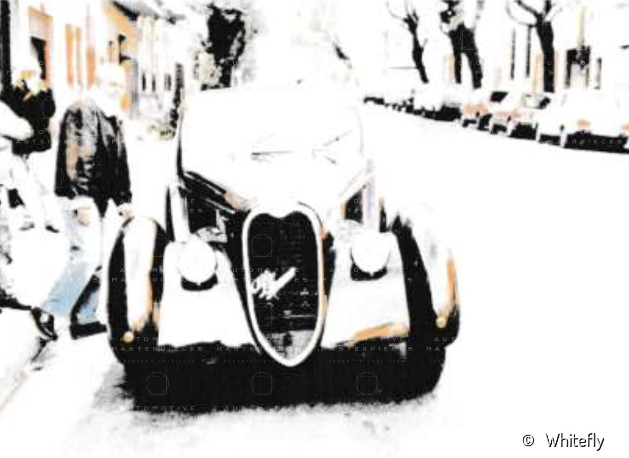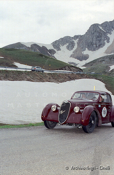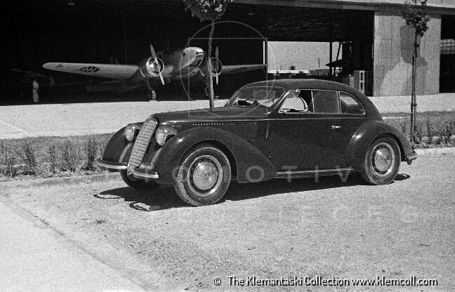 Record 1 Jun 1940 The car bearing its 1st plate (BS 15073) in an environment suitable for both Mazzotti and Lana, i.e. parked next to a Caproni Ca.310 Libeccio, a twin-engine reconnaissance plane, with the insignia of the Regia Aeronautica, on the Ponte San Pietro airfield (Bergamo, Italy). The date of the Millanta shot (June 1940) suggests that the car was already owned by Lana. Probably the license plate MI-73396 was never mounted by the Alfa Romeo dealership and Lana also waited before being able to mount the license plate SV-5912.
