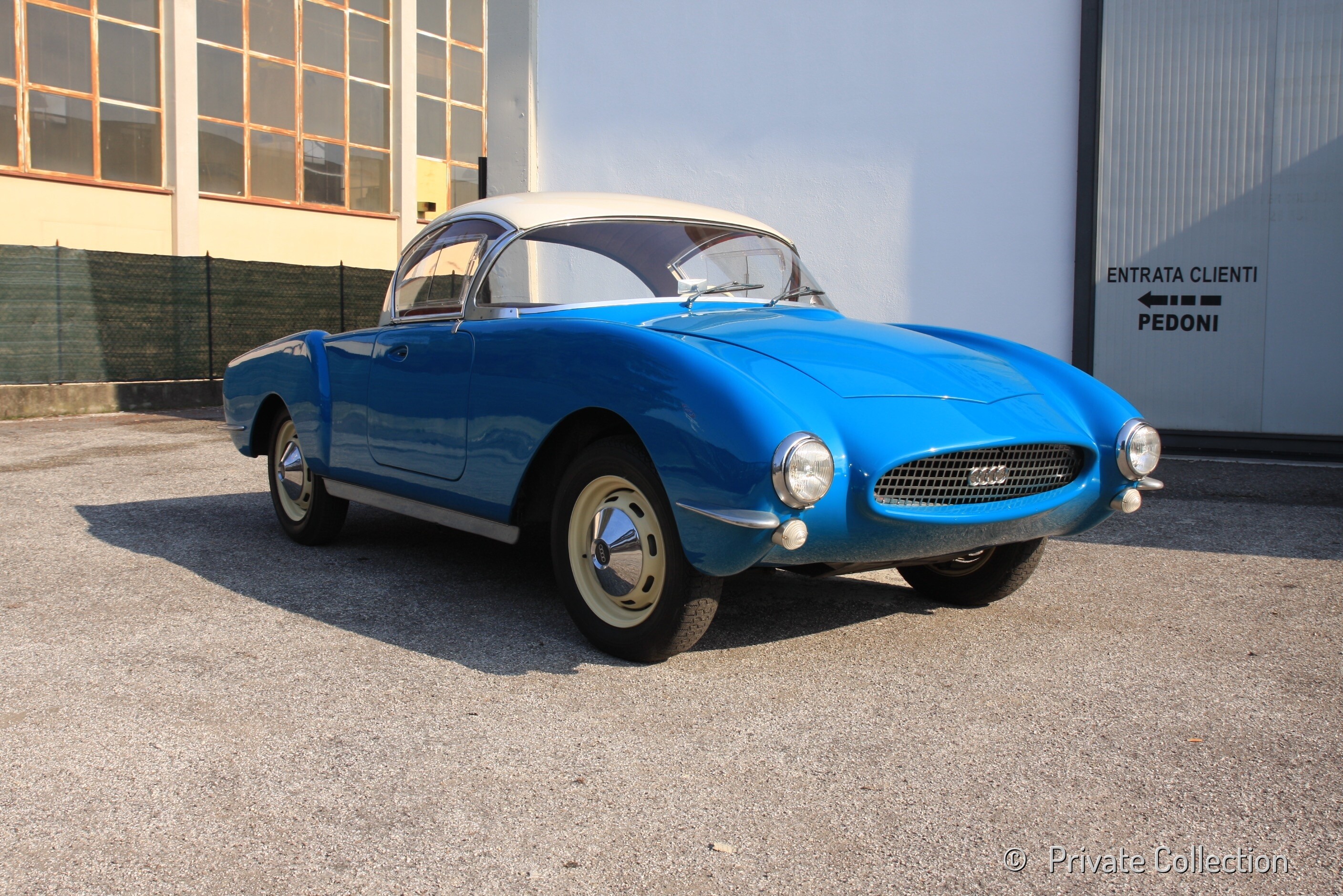 The DKW 1000 Hardtop Coupé Lüscher chassis no. 68594162 is one of the cars built by Ernst Lüscher, using the DKW 3=6 Monza as a base. It was bought by Ernst Lüscher in 1959 and it was refitted in 1962. This model stands out for the presence of an hardtop and for even more rounded shapes than those of the Monza, as well as for some differences in the interior, concerning the position of the speedometer. After being sold by Lüscher in 1964 it remained in Switzerland until 1985, when it arrived in southern Italy where, in the early 90s, it participated, driven by lawyer Romei, to several competitions such as the “Giro delle Calabrie” (1991, 1992) and “MilleCurve”. After the death of Romei in 1997, the car was sold by his brother to an Italian private collector, who restored and repainted it in the probably original light blue color, with white hardtop.