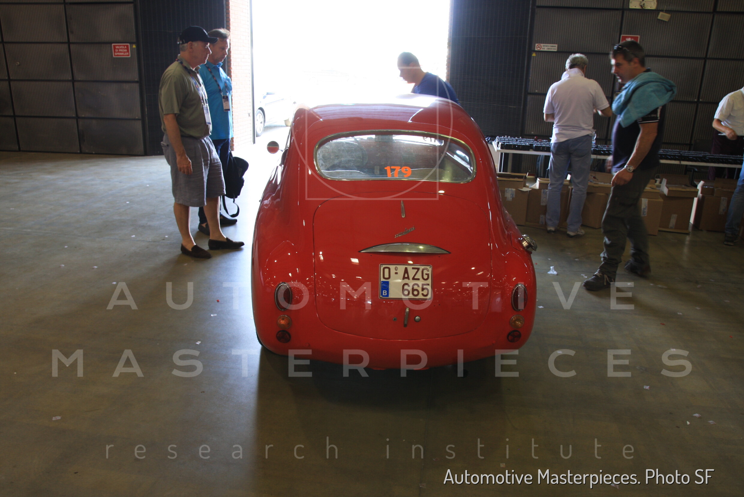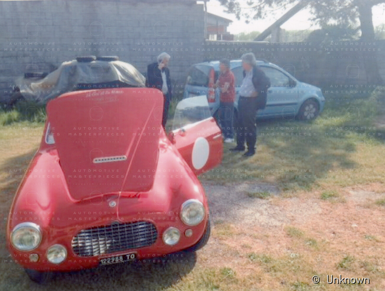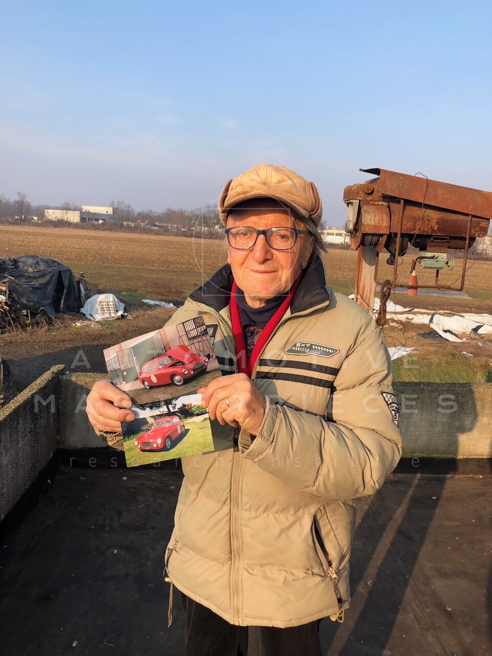 Giuseppe Pilone shows a piece of aluminum front fender replaced during the restoration and still in his shed. He also kept two images of the fresh restoration car.