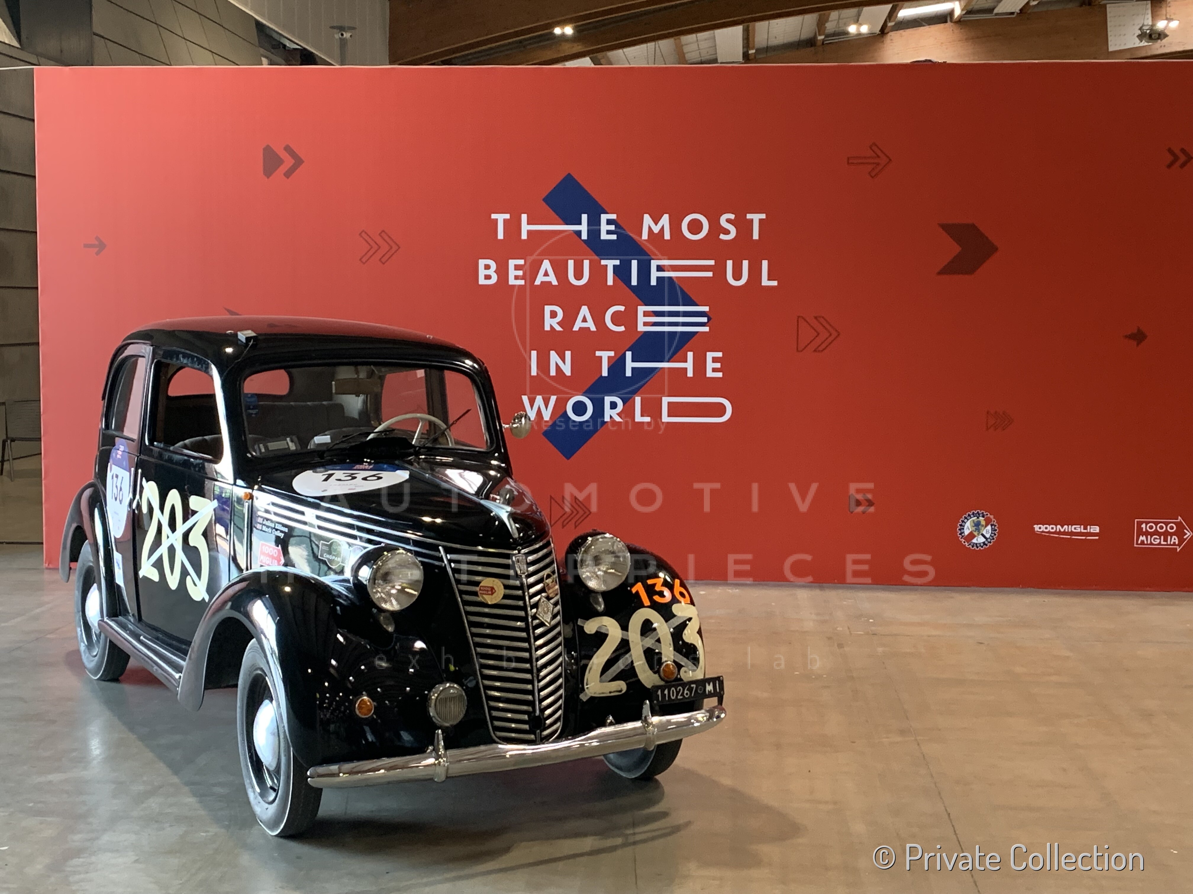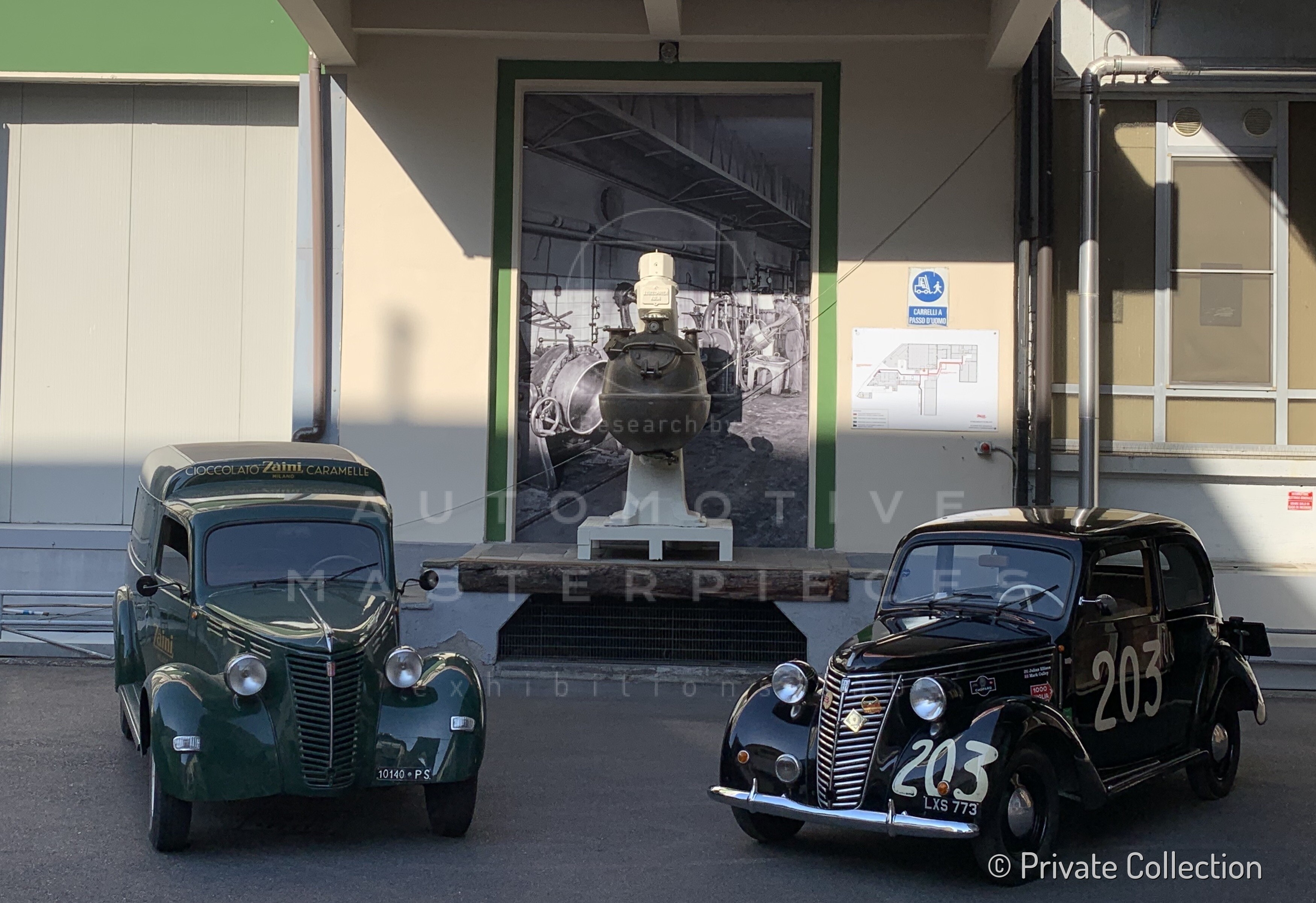 The 1947 Fiat 1100 (Fiat) sn 1100*293098* was completed in December 1947 and registered exactly one month later, in January 1948, with Milan plates. The car is registered to the "Società di Fatto Luigi Zaini", an important family-run "Factory of Chocolate, Cocoa, Candies, Jams and Similar" founded in Milan in 1913. Once the founder, Luigi, died prematurely, the company was run for a period by his widow, Olga: it was an exceptional fact for the time to see a woman at the helm of a company. In the mid-1950s she handed over the helm to her two sons: Vittorio and Pietro but, before this commitment, the young Pietro would still have the freedom to be a gentleman driver. As could only happen at the time, Pietro entered the most important road race in 1949 with the family car (perhaps purchased for the occasion?): the Mille Miglia. His lifelong friend and companion on a thousand adventures, Pietro Moscatelli, was his co-driver. The black sedan lined up with the racing number 203 painted on the doors at the starting line at 2:03 AM on April 24. It was able to get to the end of the race, covering it with a good pace; in fact, it qualified 120th overall and 37th in class. A more than honorable result for a 1100 cc private touring sedan. At the end of the summer Zaini sold the Fiat 1100 to a new owner, who was in turn followed by a few others until, today, the car is completely restored and returns to the roads of the Mille Miglia, taking part in the re-enactments. On June 13, 2022, Automotive Masterpieces organized a photoshoot of the car in front of the company of the first owner Zaini with his nephew Luigi.