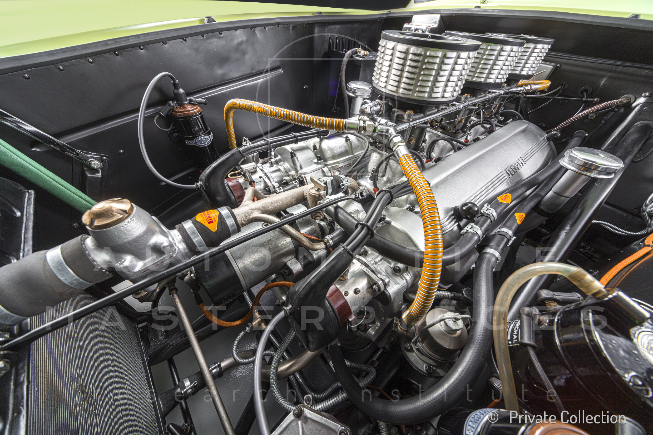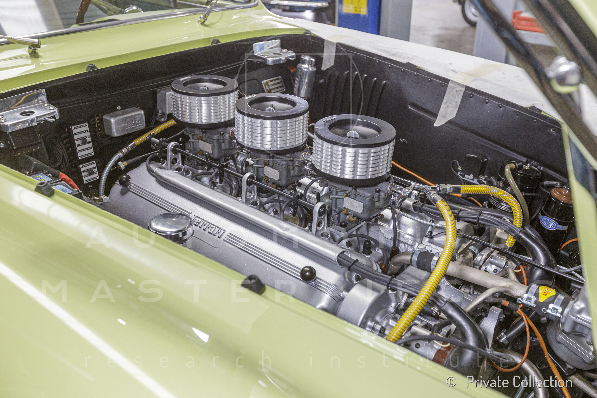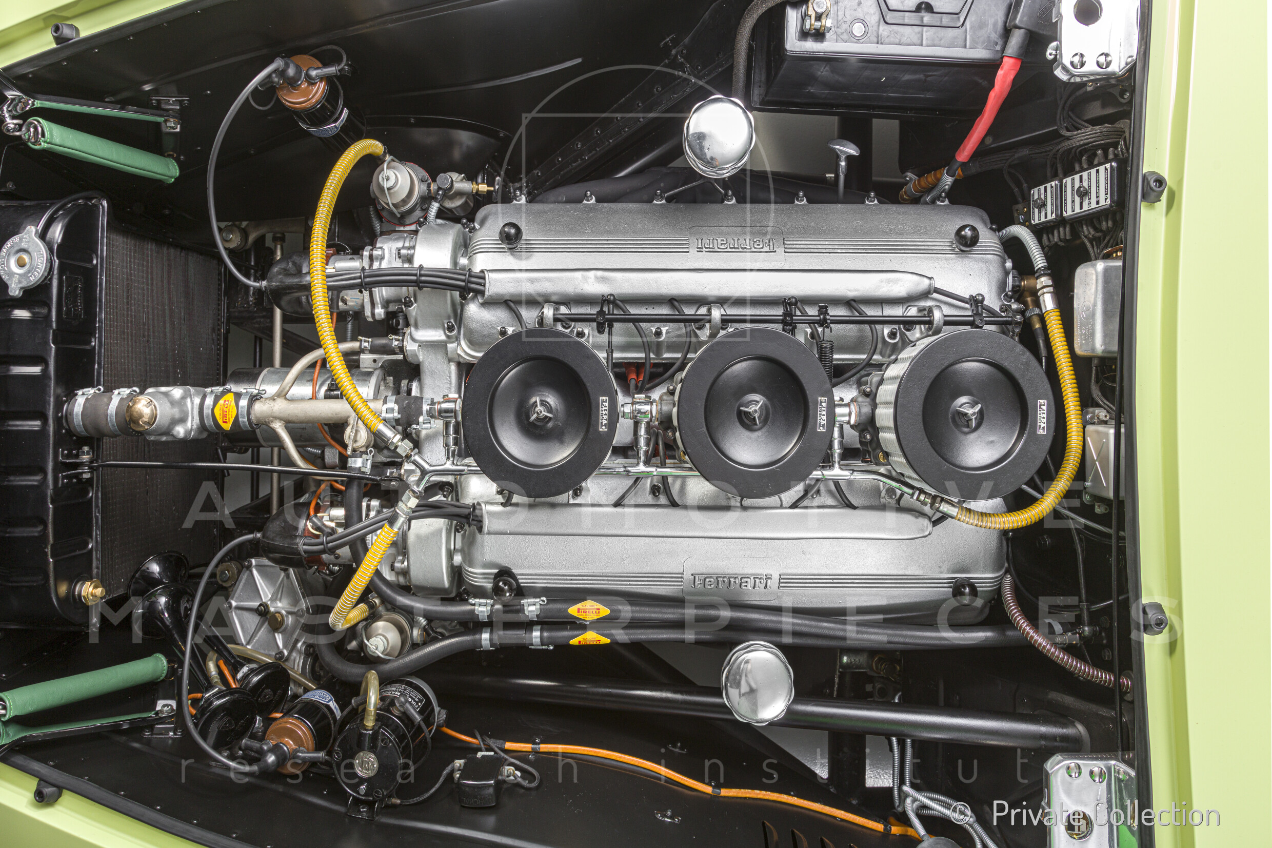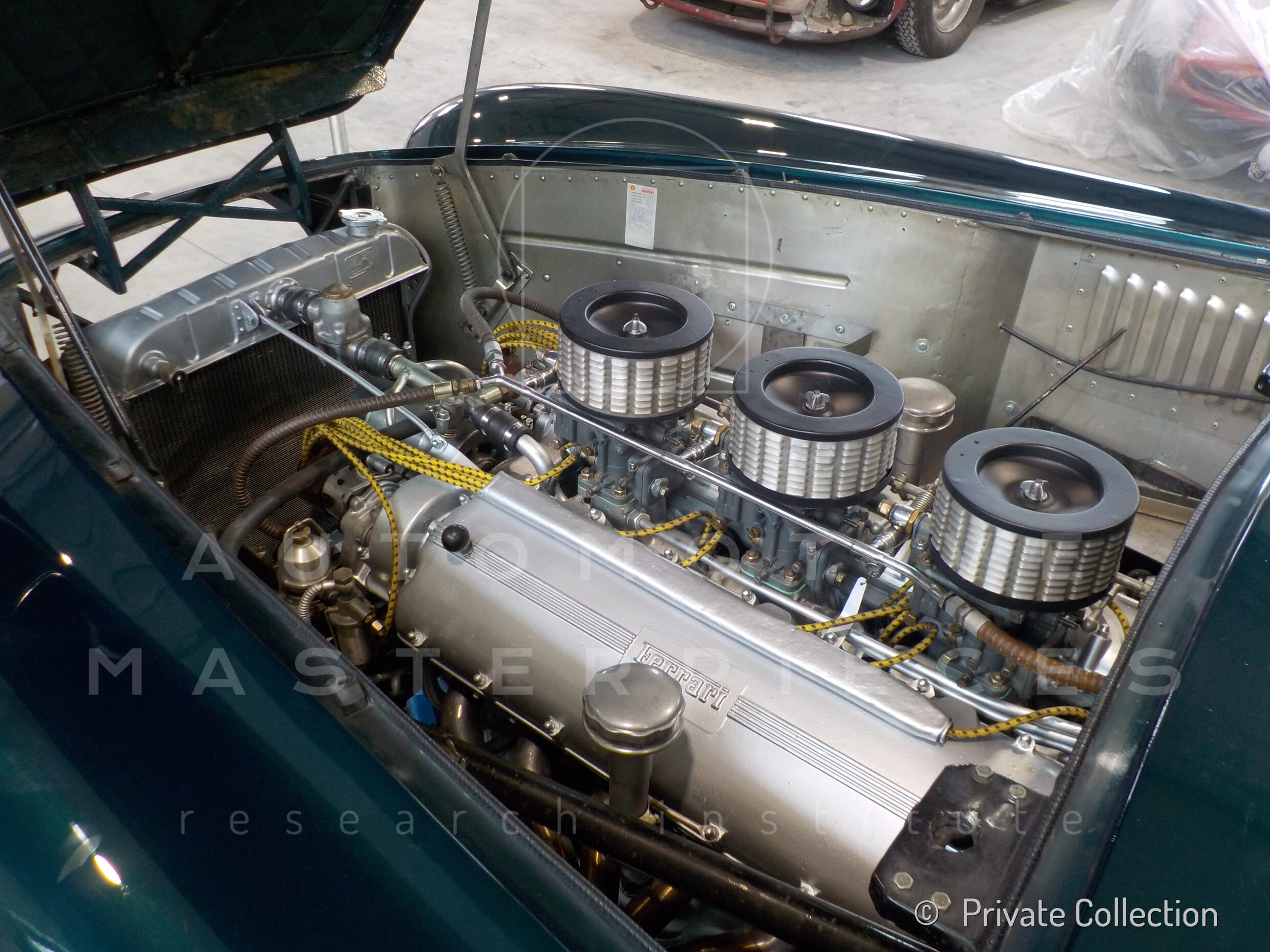 Internal engine number 094. 60° V-type. 3-liter version of the Lampredi V12, known for its larger size and torque-oriented characteristics, well-suited to meet the demands of a powerful grand tourer. It appears that Ferrari produced only a limited number of 250 Europas with this engine, installing the Colombo V12 in later cars. The precise number equipped is a subject of debate.