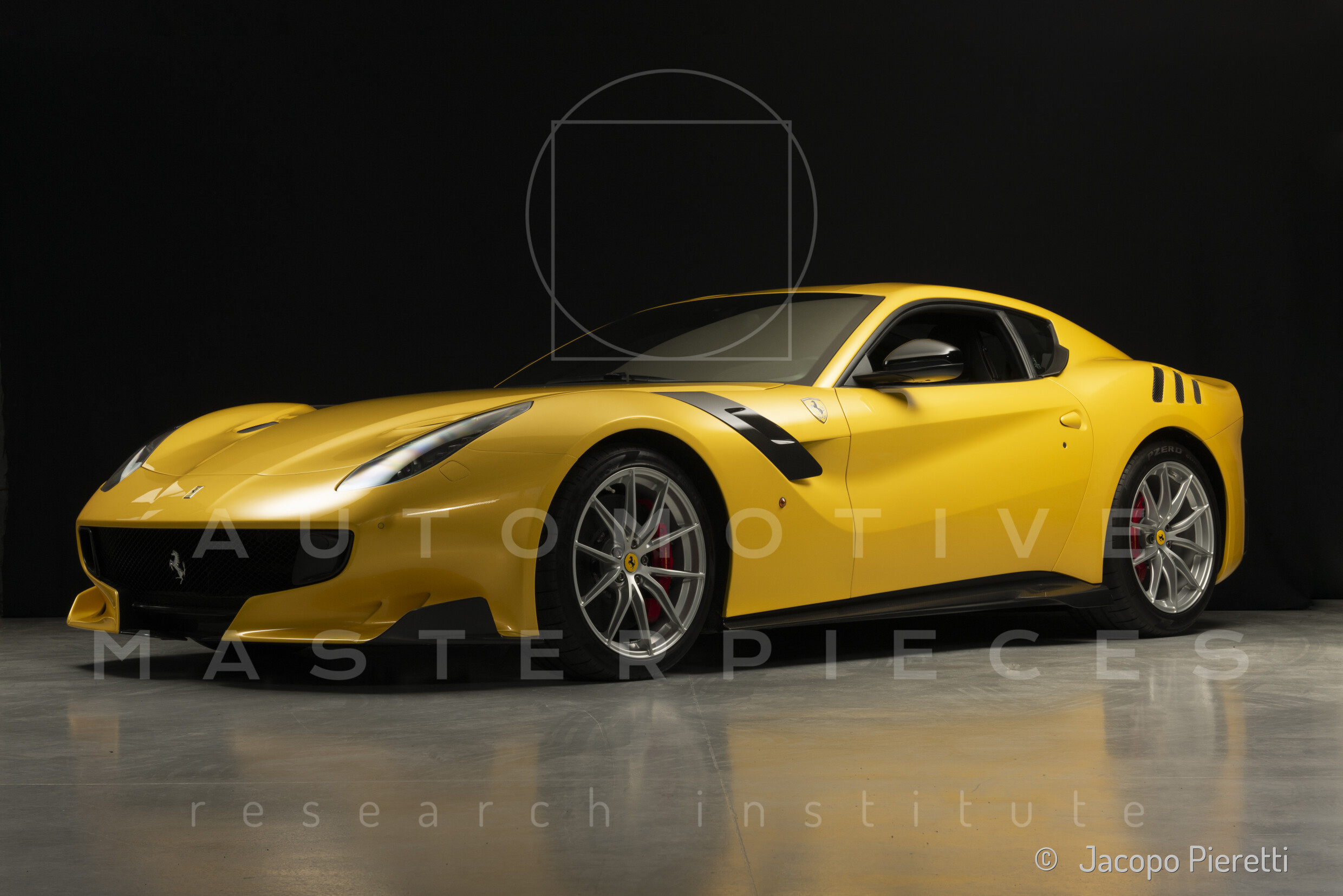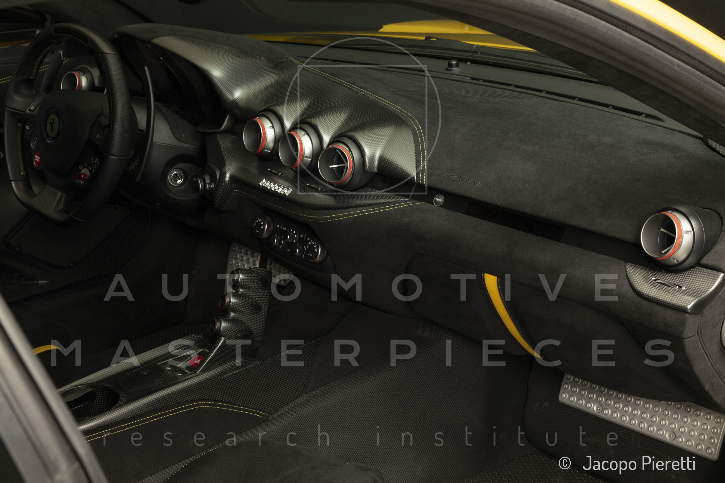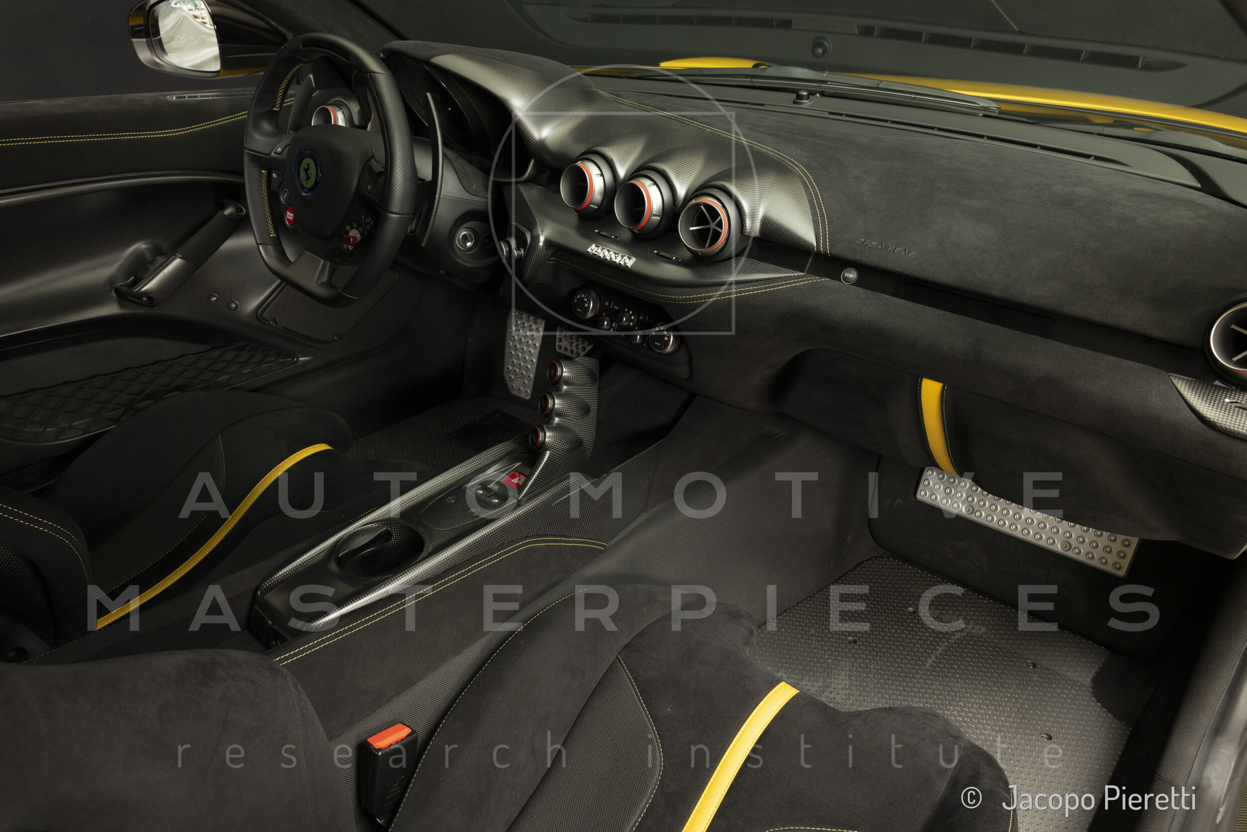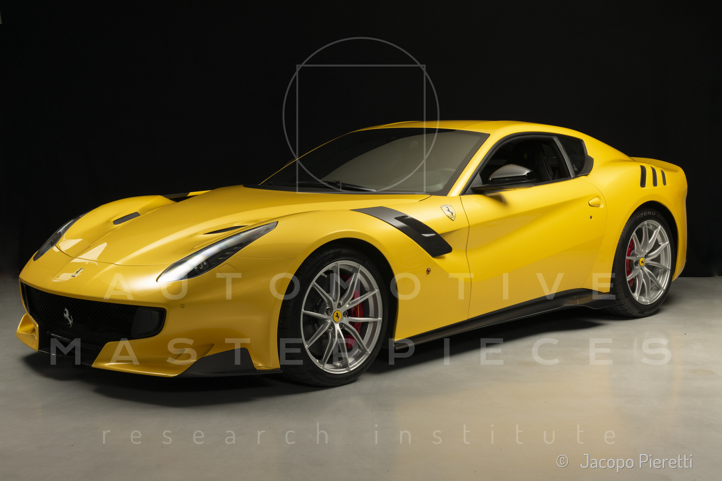 Fully reworked aerodynamic package with a more aggressive front splitter, active rear diffuser, and extended spoiler. Six vertical vanes under the body contribute to a total downforce of 230 kg at 200 km/h—107 kg more than the standard F12. Larger vents and revised body contours improve airflow, while the overall design enhances stability and high-speed grip.