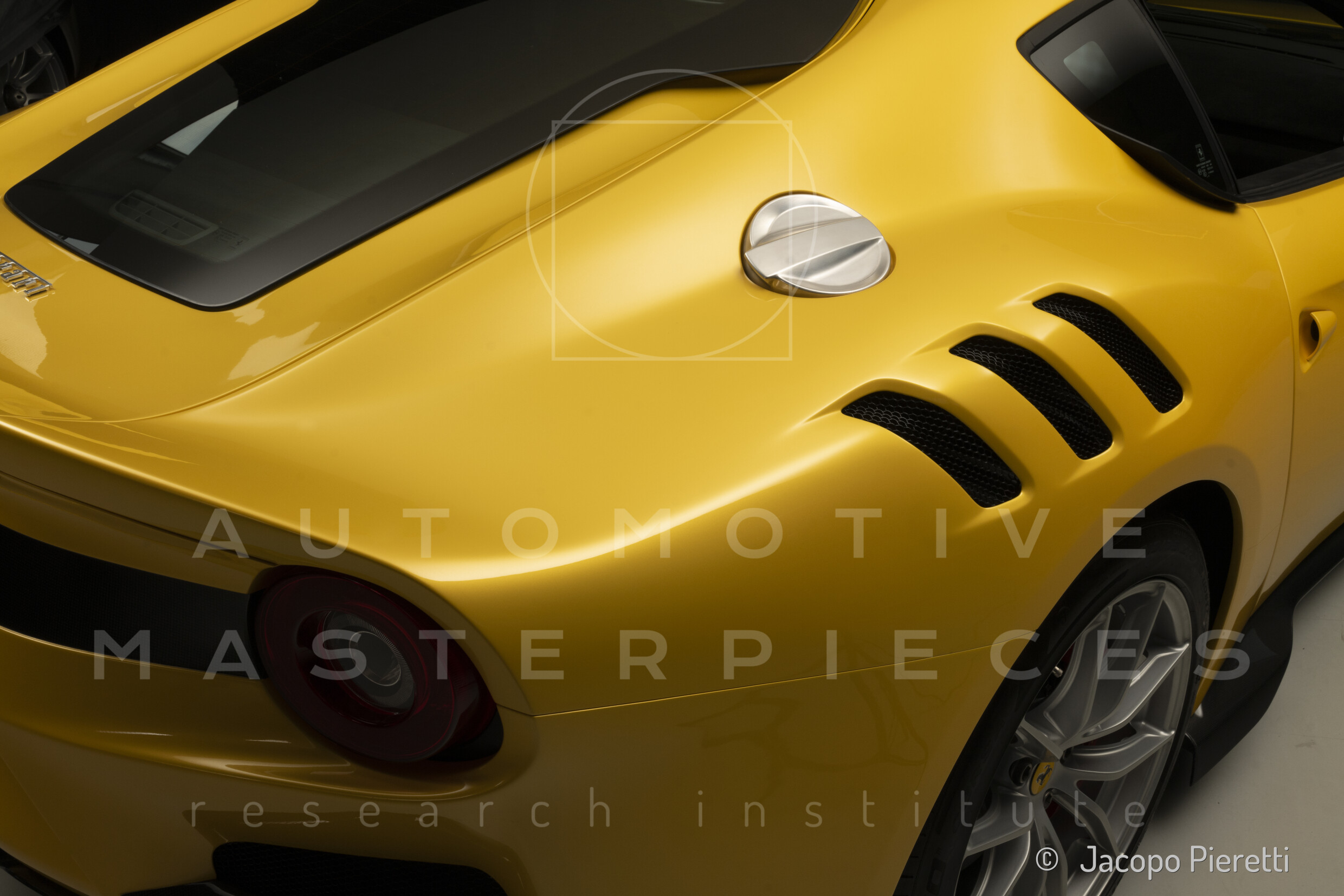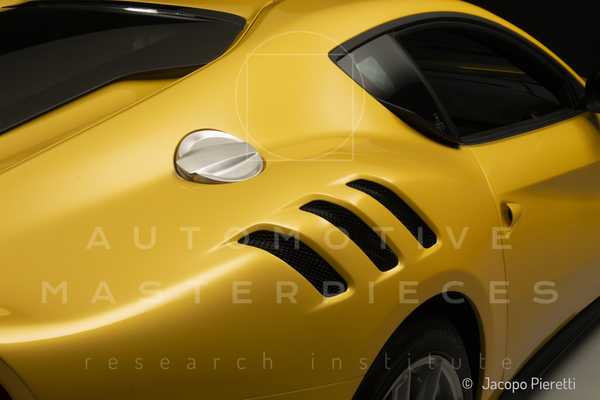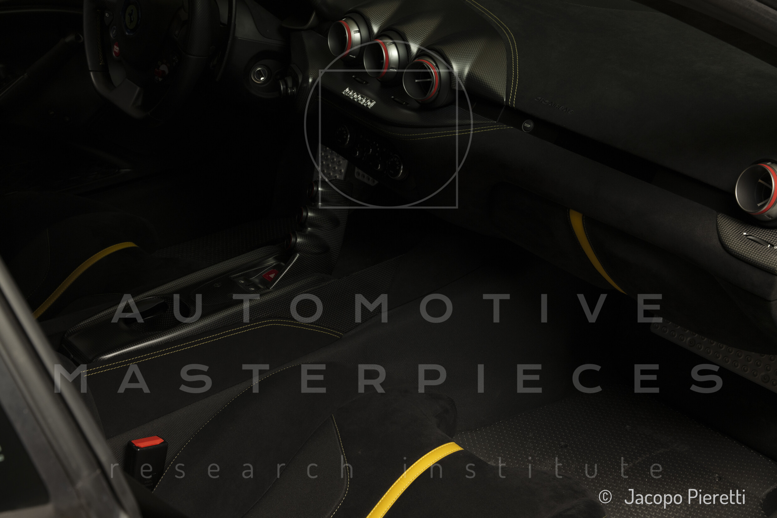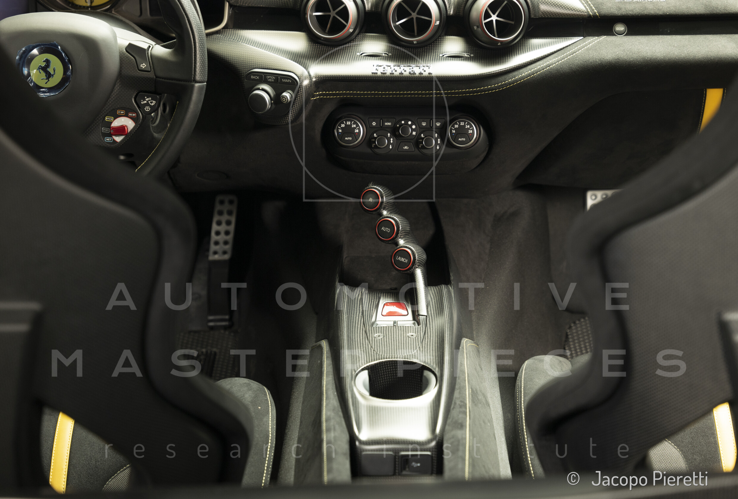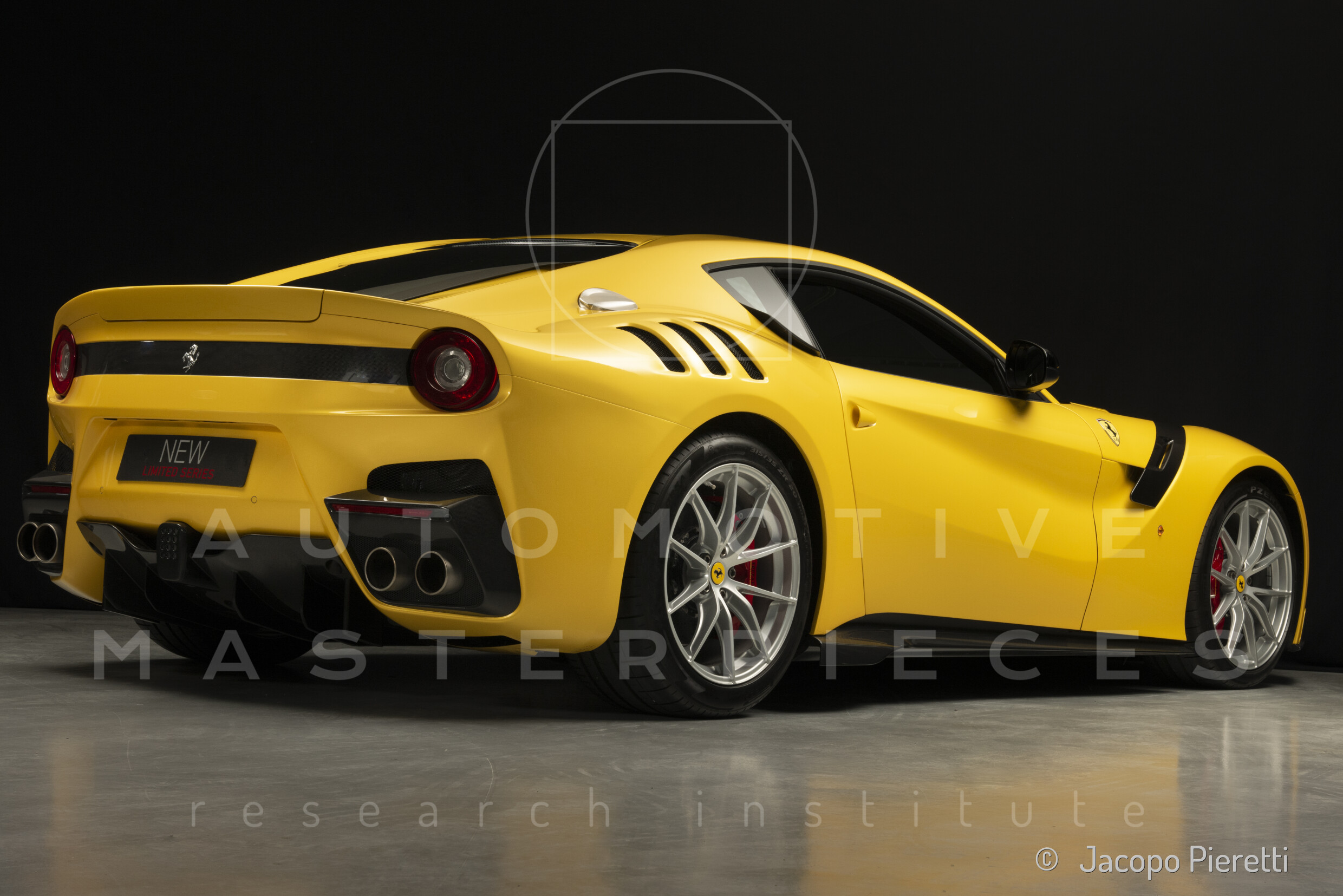 Fully reworked aerodynamic package with a more aggressive front splitter, active rear diffuser, and extended spoiler. Six vertical vanes under the body contribute to a total downforce of 230 kg at 200 km/h—107 kg more than the standard F12. Larger vents and revised body contours improve airflow, while the overall design enhances stability and high-speed grip.