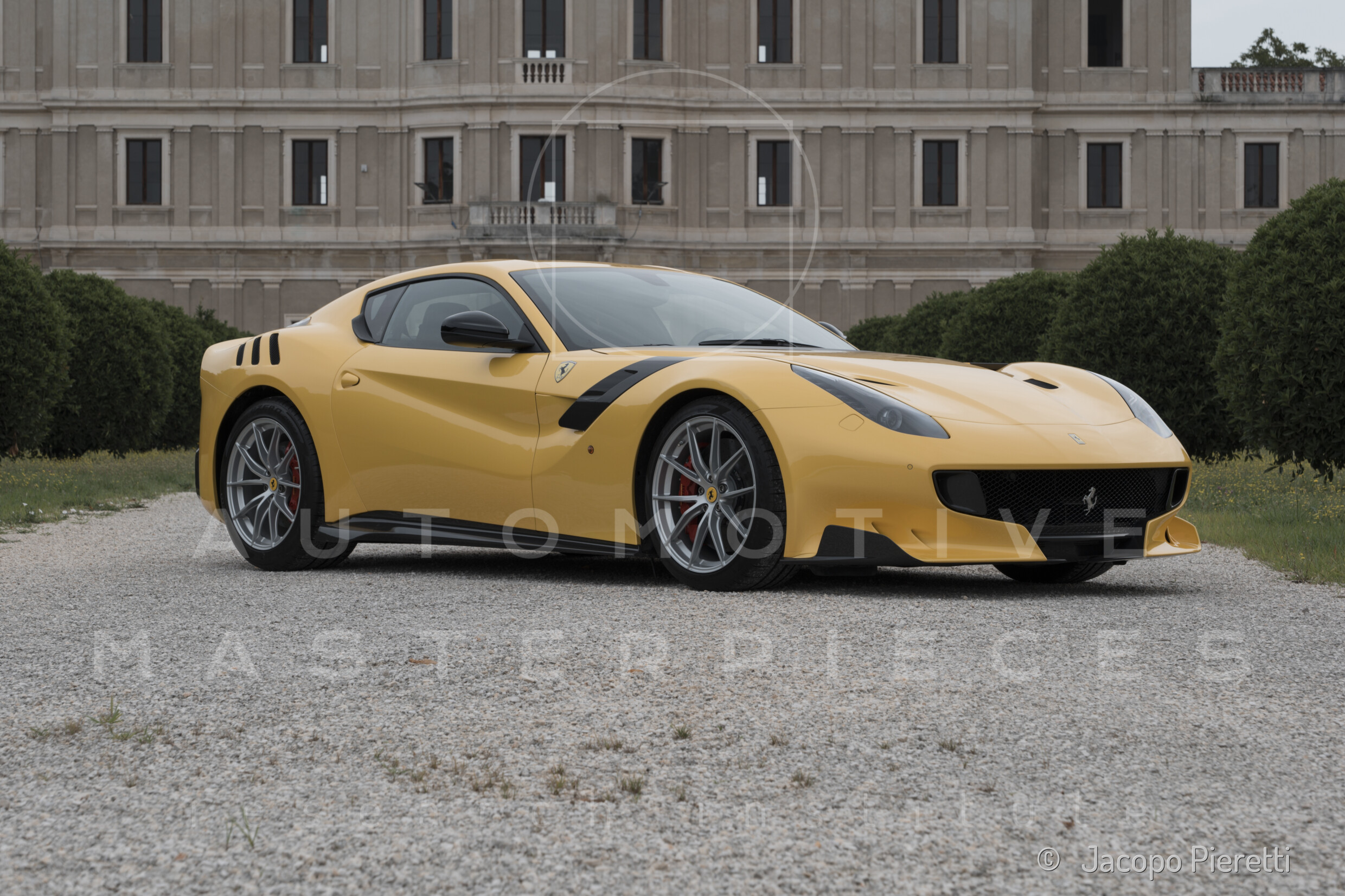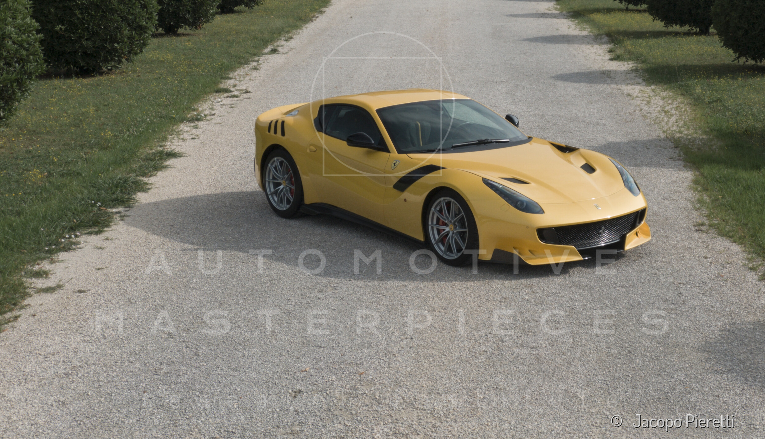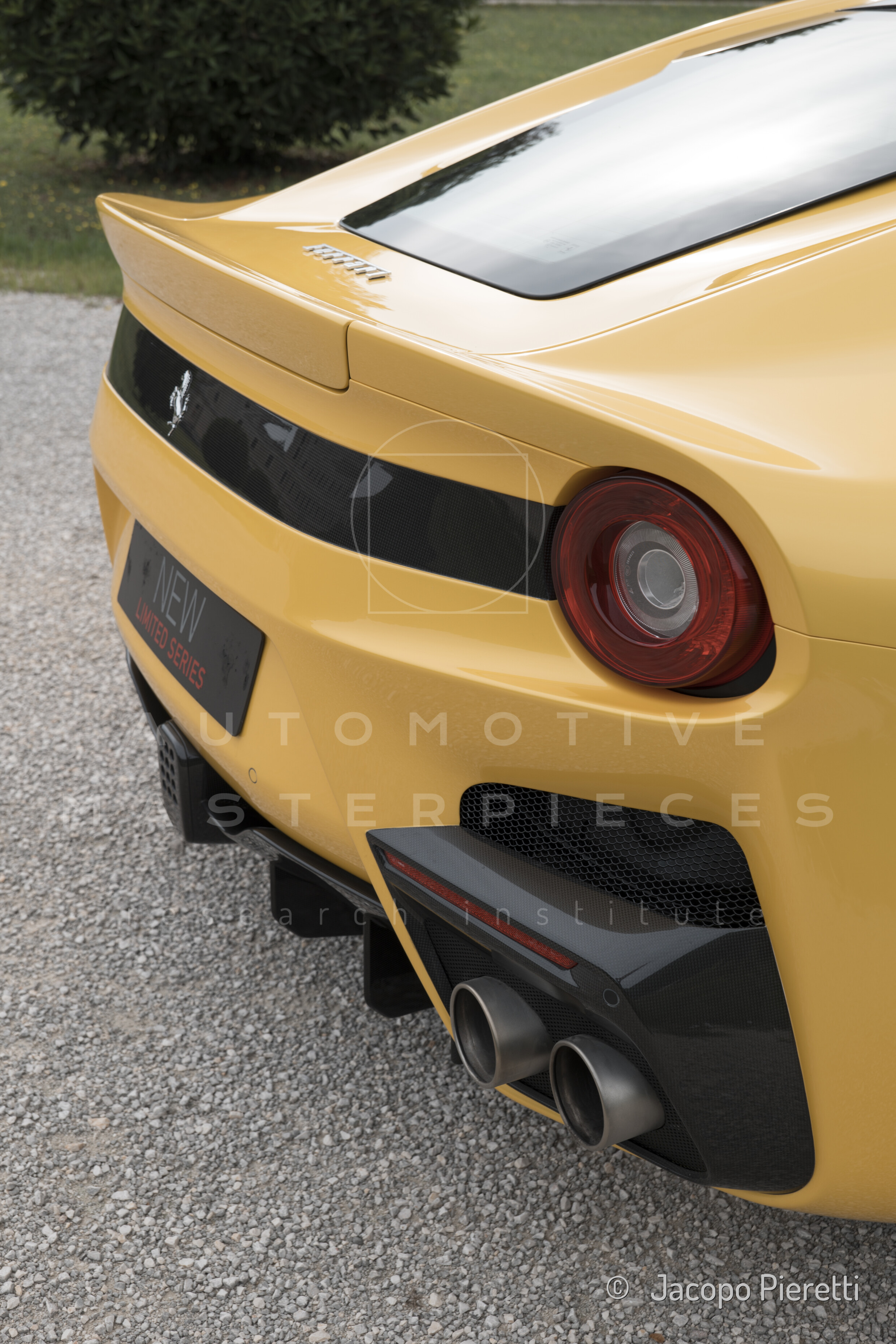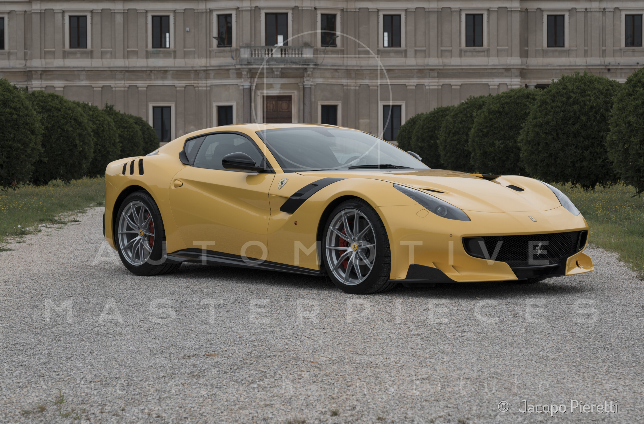 Fully reworked aerodynamic package with a more aggressive front splitter, active rear diffuser, and extended spoiler. Six vertical vanes under the body contribute to a total downforce of 230 kg at 200 km/h—107 kg more than the standard F12. Larger vents and revised body contours improve airflow, while the overall design enhances stability and high-speed grip.