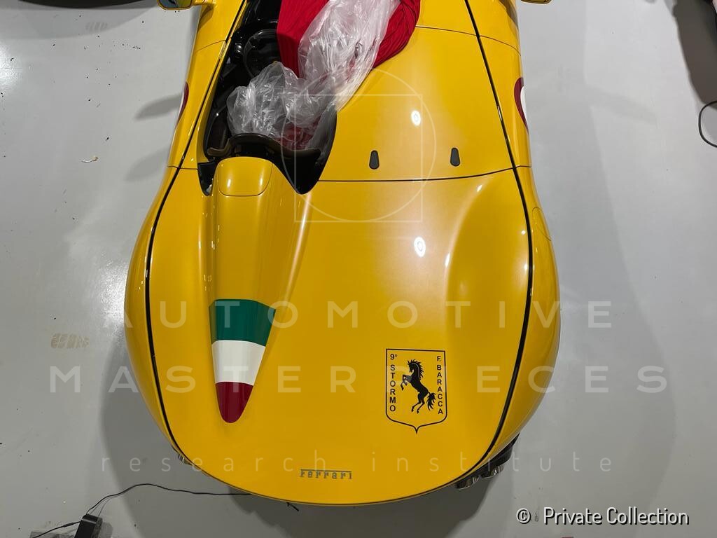 Livery tribute to Francesco Baracca: tricolour details; silver front finish creating a graphic separation; large shield on the tail featuring the black prancing horse and the inscription “9° Stormo F. Baracca;” other markings, "SVII" and "S2445", referring to Baracca's airplane.