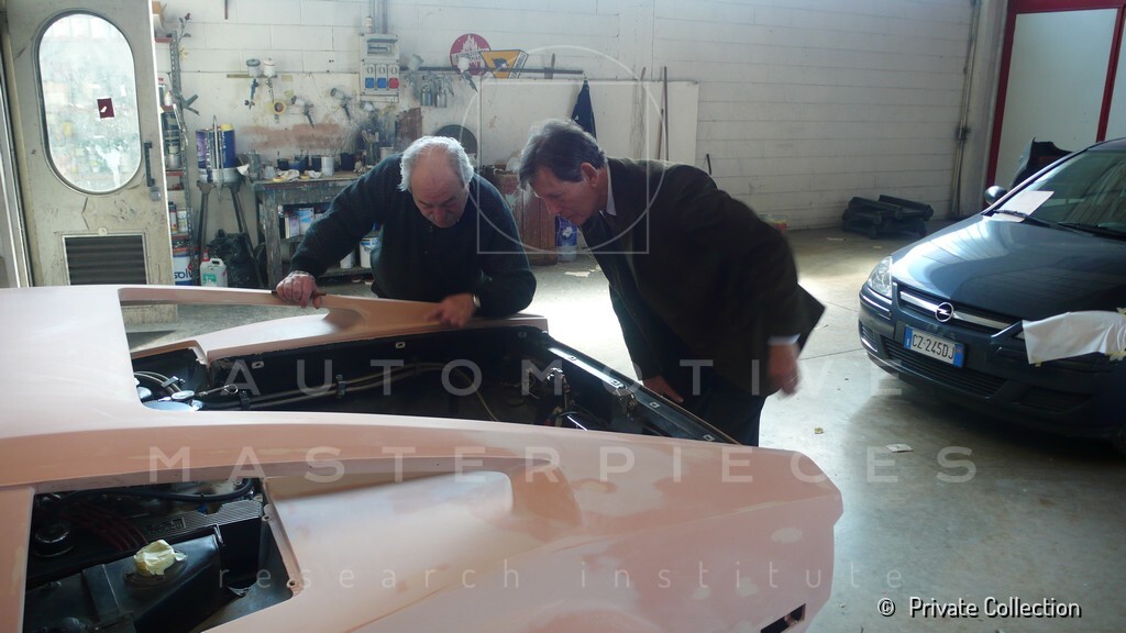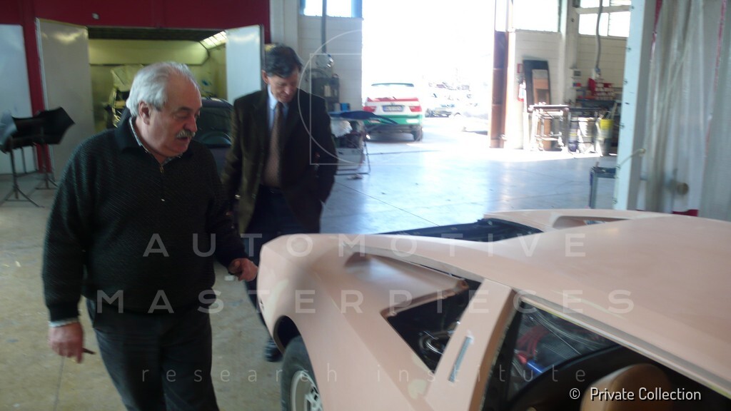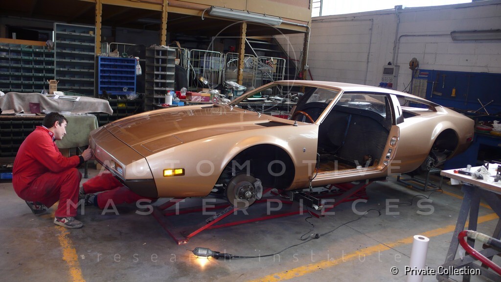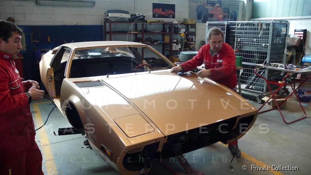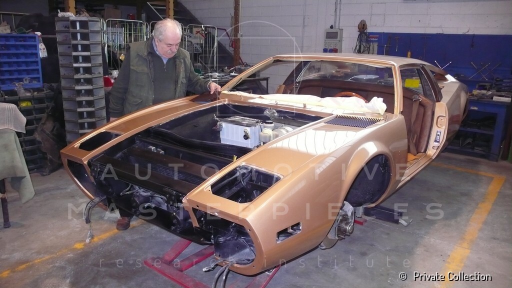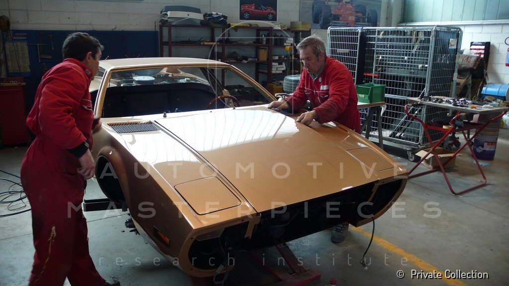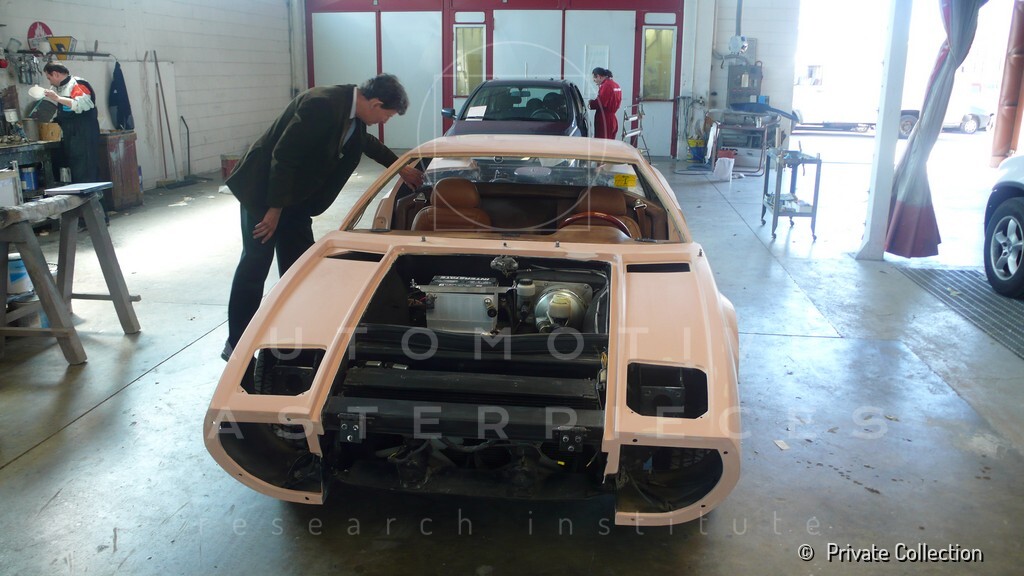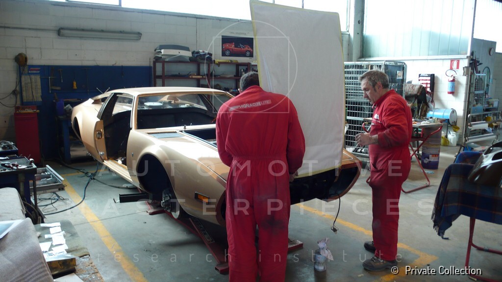 Don De La Rossa supervises the "conversion" of the "Pantera II 7x" to "Montella" road car as follows: remove Pantera name from nose and tail, added rubber strip around belting, added hood vent to allow radiator hot air to exit, added side mirrors, repainted car in pearl white over metallic bronze, added De Tomaso and Montella nameplates