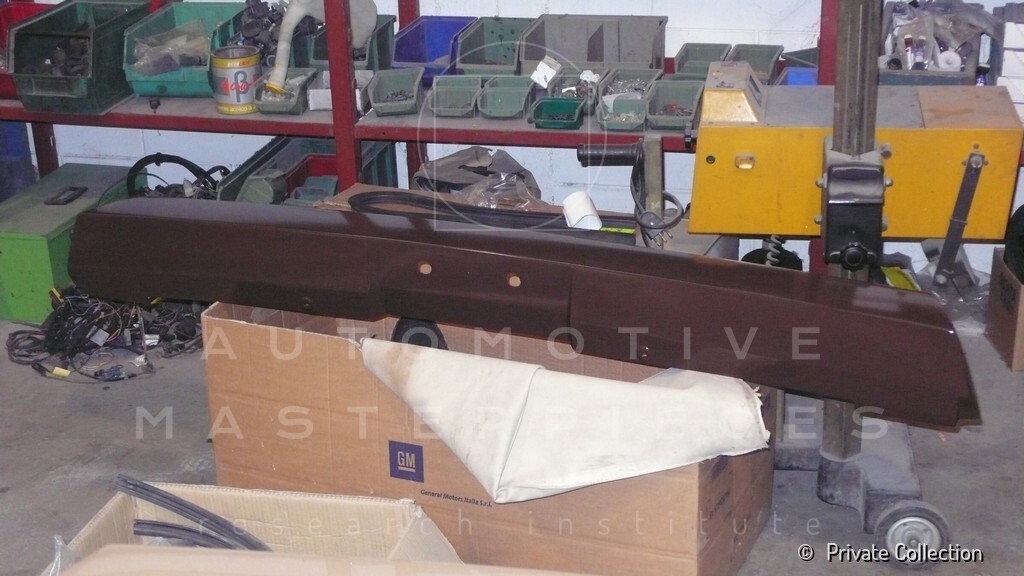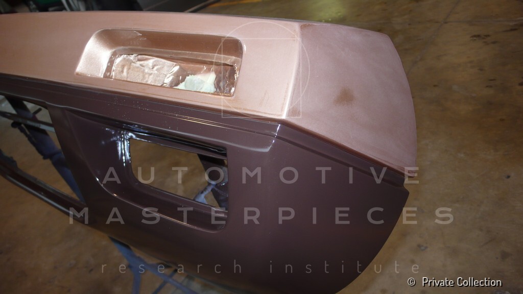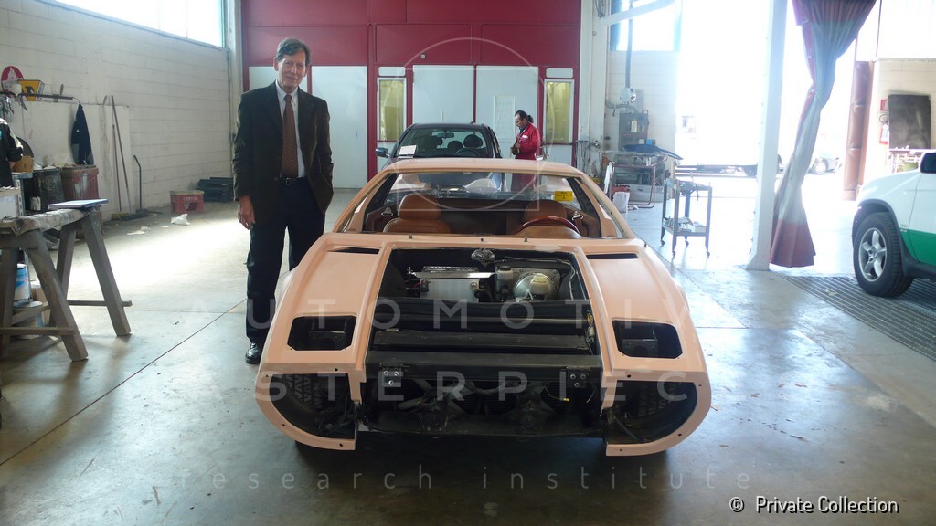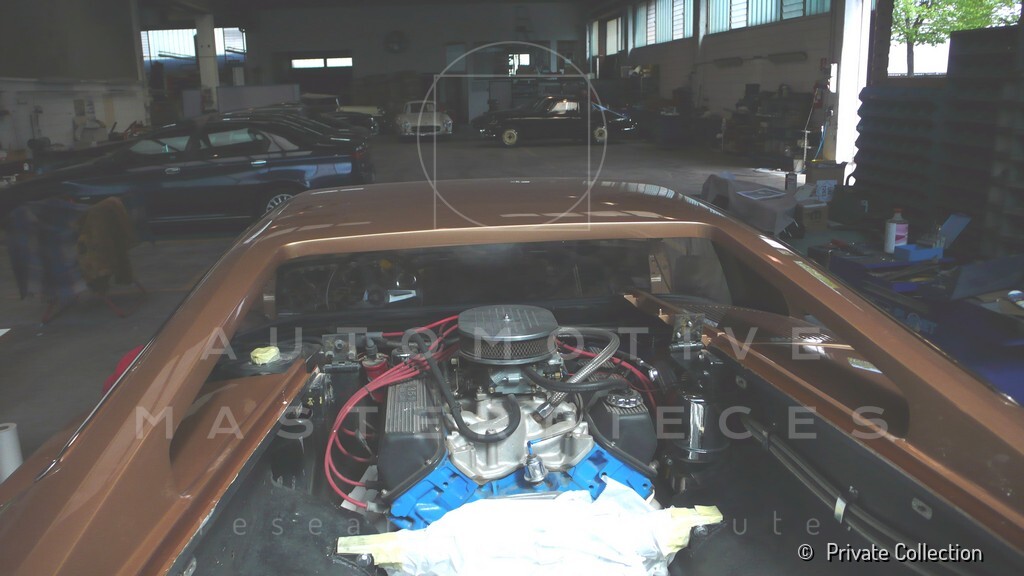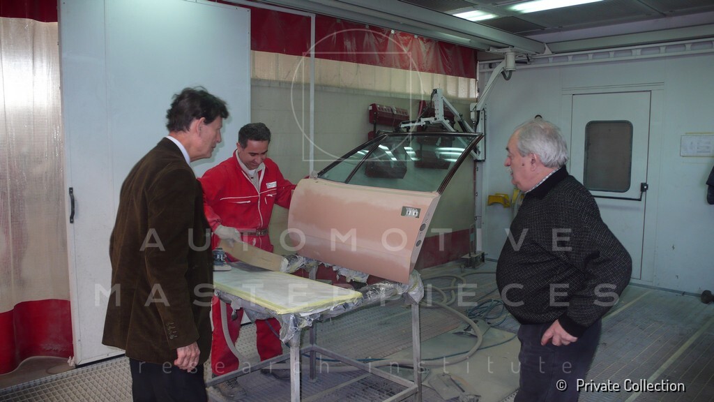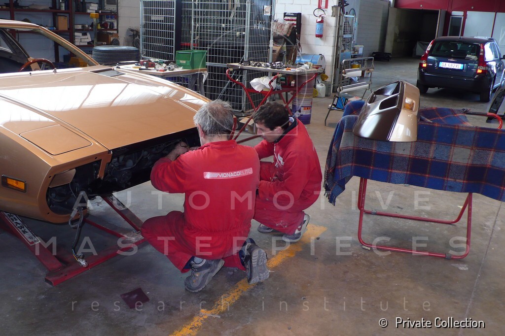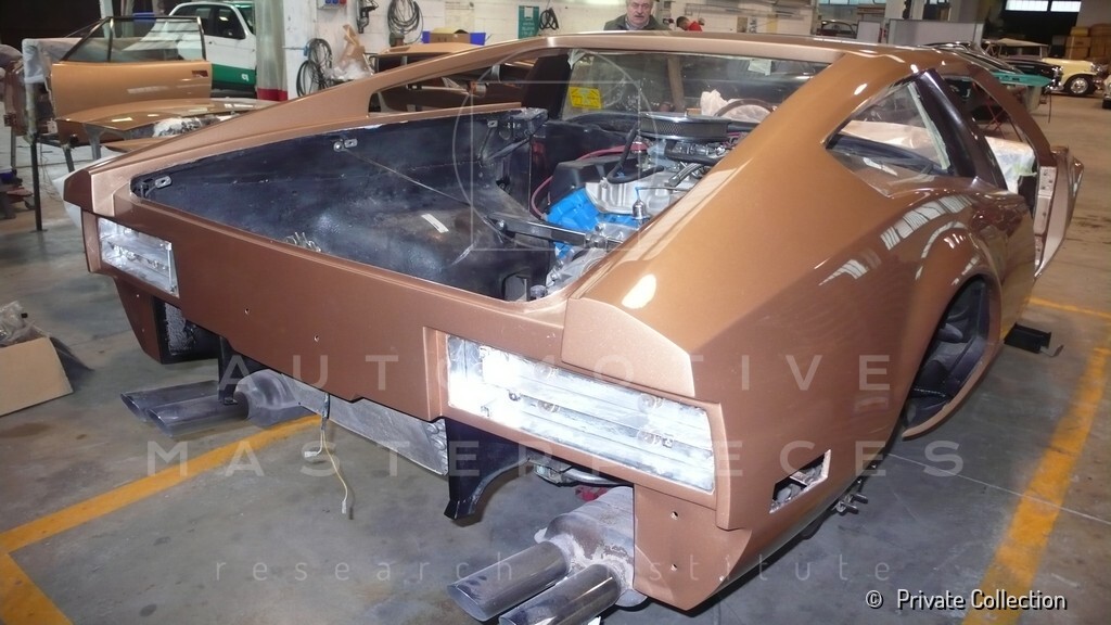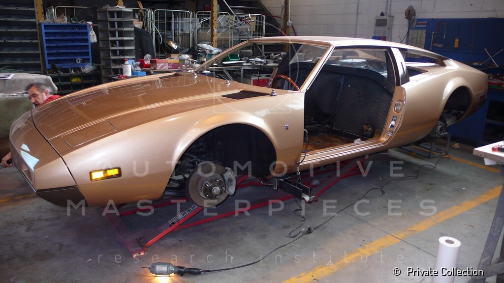 Don De La Rossa supervises the "conversion" of the "Pantera II 7x" to "Montella" road car as follows: remove Pantera name from nose and tail, added rubber strip around belting, added hood vent to allow radiator hot air to exit, added side mirrors, repainted car in pearl white over metallic bronze, added De Tomaso and Montella nameplates