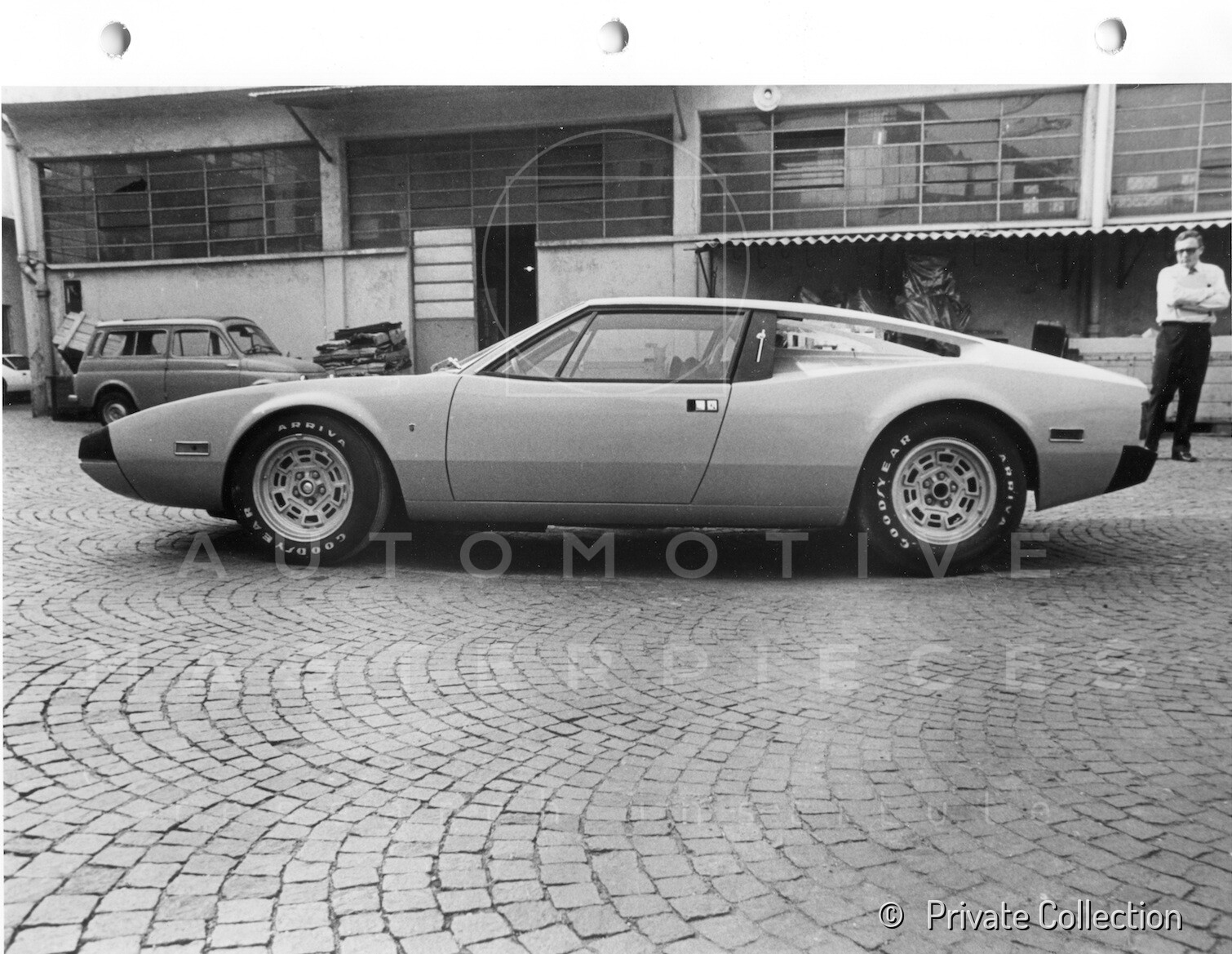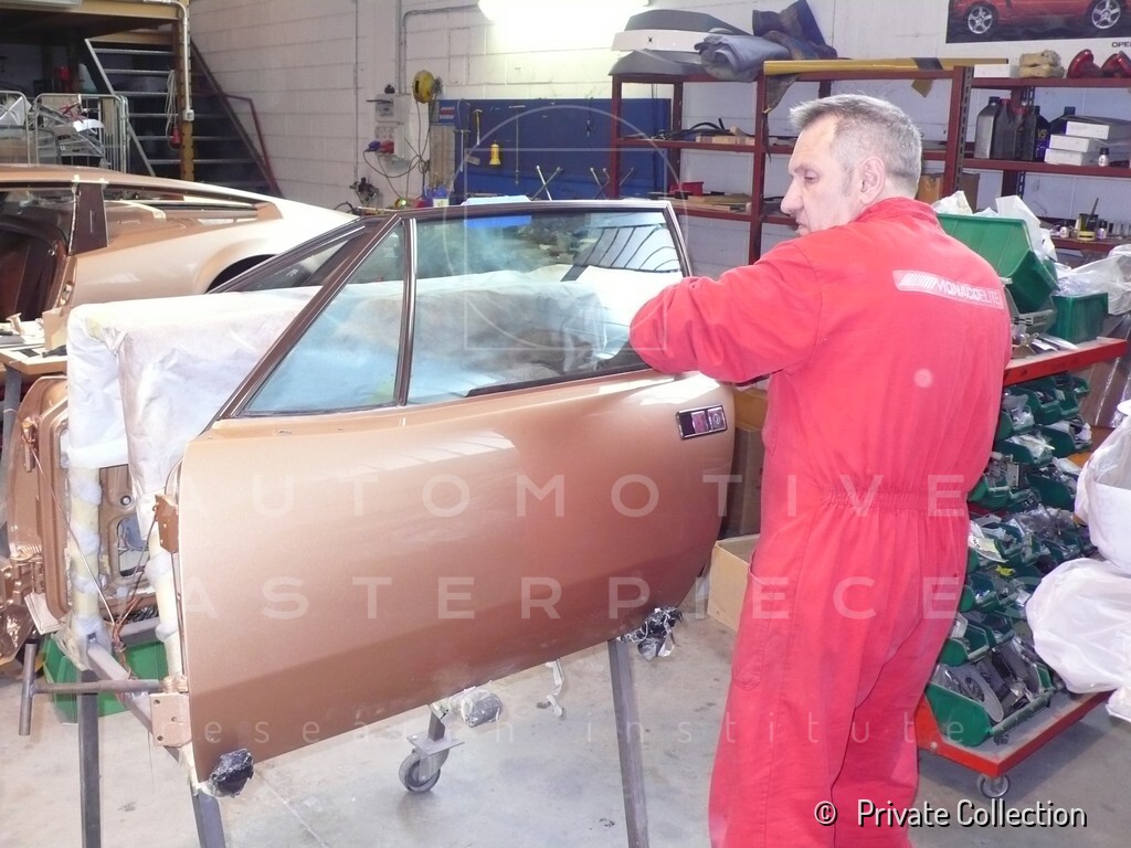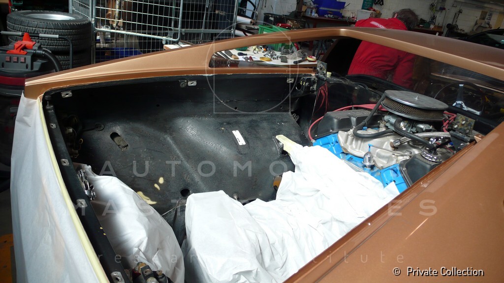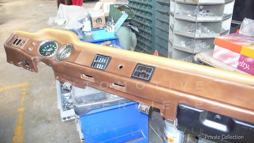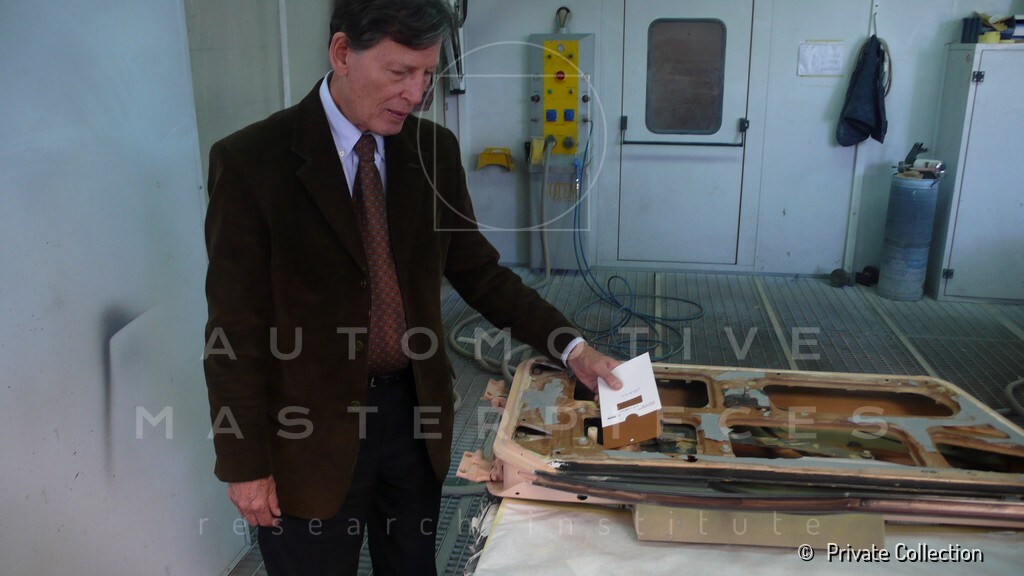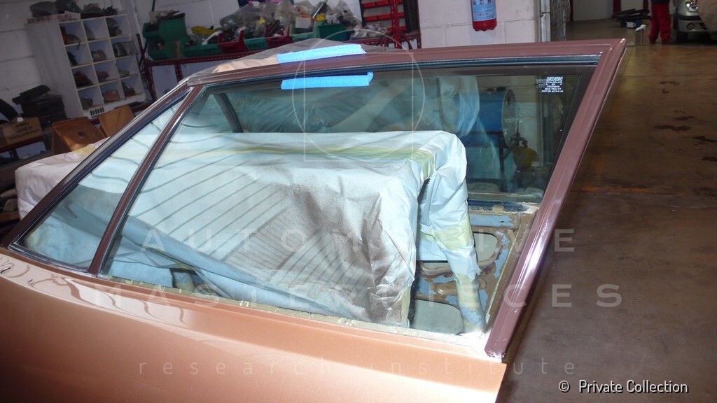 Don De La Rossa supervises the "conversion" of the "Pantera II 7x" to "Montella" road car as follows: remove Pantera name from nose and tail, added rubber strip around belting, added hood vent to allow radiator hot air to exit, added side mirrors, repainted car in pearl white over metallic bronze, added De Tomaso and Montella nameplates