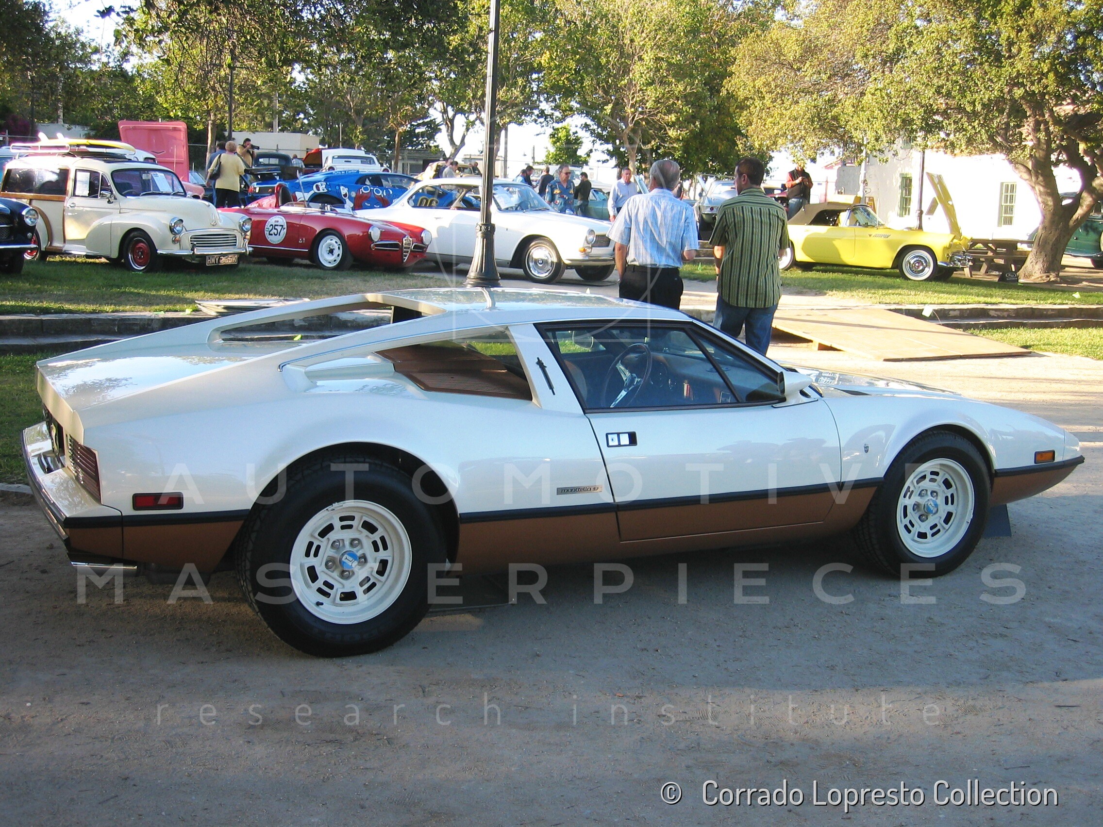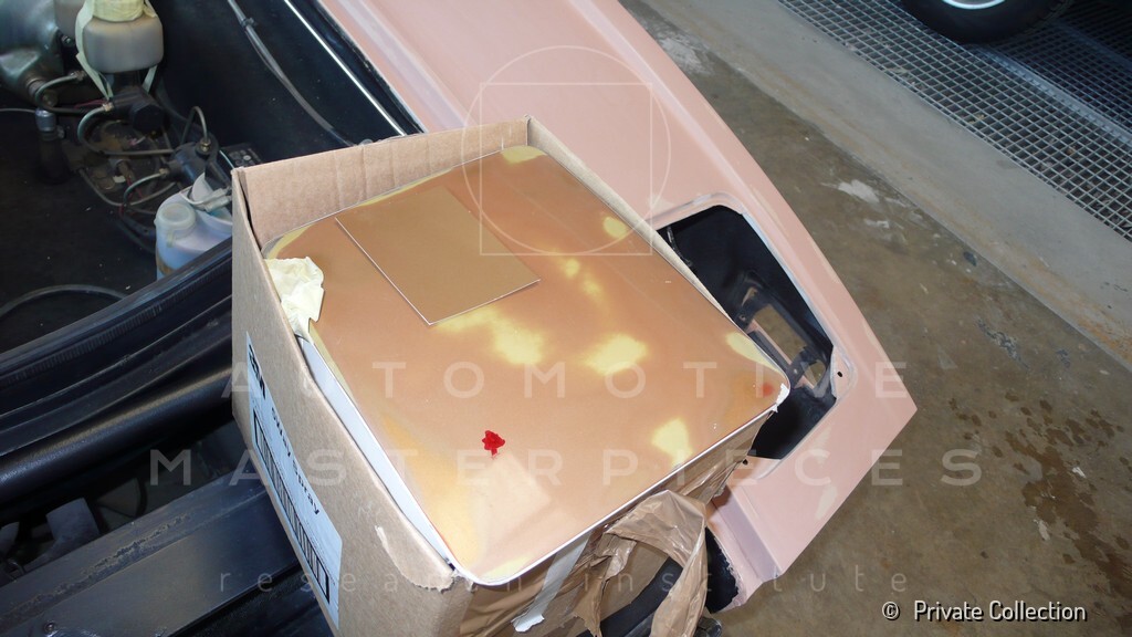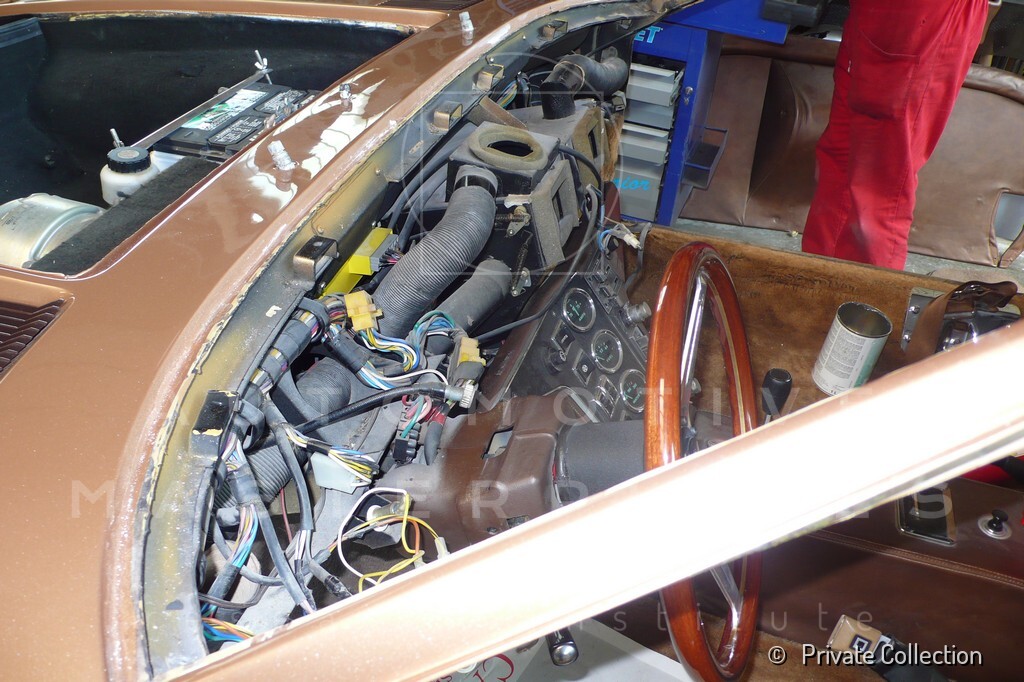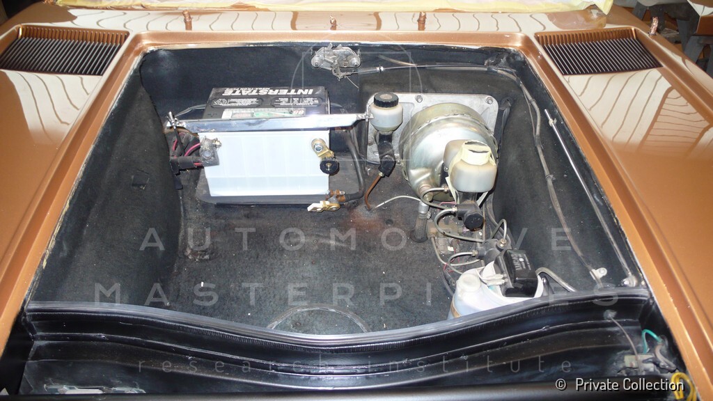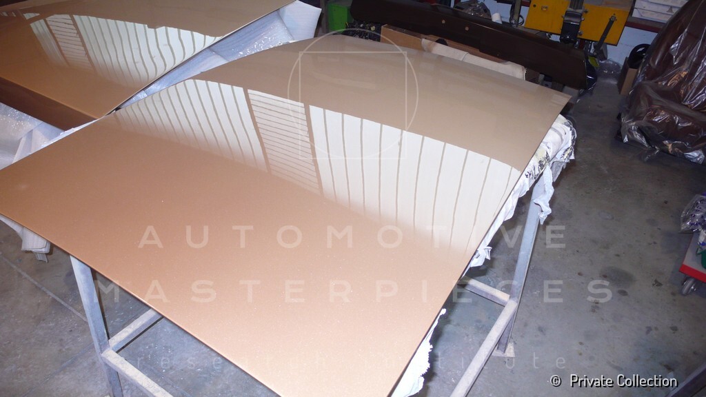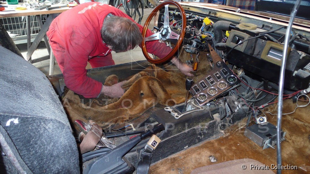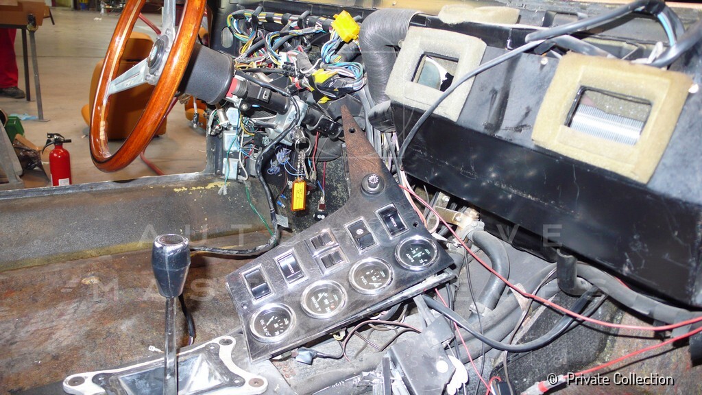 Don De La Rossa supervises the "conversion" of the "Pantera II 7x" to "Montella" road car as follows: remove Pantera name from nose and tail, added rubber strip around belting, added hood vent to allow radiator hot air to exit, added side mirrors, repainted car in pearl white over metallic bronze, added De Tomaso and Montella nameplates