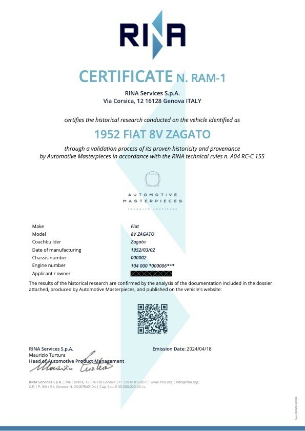 This certificate pertains to the research on the 1952 Fiat 8V ZAGATO, Chassis no. 000002. This very car is the oldest surviving and one of only six pre-production specimens, is the prototype for the thirty cars made by Zagato and is the most raced Fiat 8V. The research brought to light new findings and allowed for validations: a remarkable number of previously unpublished photos were discovered, as well as videos from the period. Much information, obtained from the analysis of contemporary press, led to corrections of the history handed down. Finally, participations in events that were not previously known were discovered; at least 8, totaling 74 races competed in.
